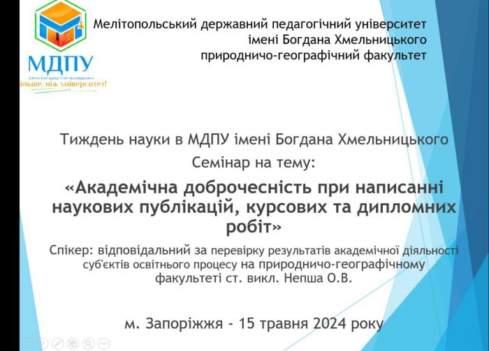 🏛️💫15 травня 2024 року в рамках тижня науки в Мелітопольському державному педагогічному університеті імені Богдана Хмельницького на природничо-географічному факультеті в онлайн-форматі було проведено семінар на тему: ✅🇺🇦«Академічна доброчесність при написанні наукових публікацій, курсових та дипломних робіт».