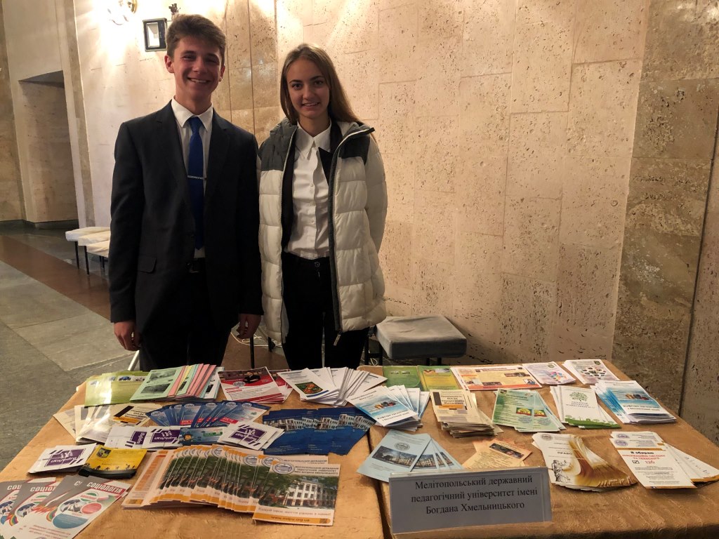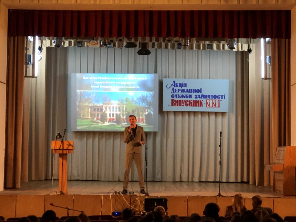 Студенти Фурсова Катерина та Ковальов Андрій розповіли про спеціальності, що ліцензовані в Мелітопольському державному педагогічному університеті імені Богдана Хмельницького, виробничими та навчальними практиками та особисті враження від навчання в університеті. Завершив виступ Солонюк Богдан з піснею «Де би я».