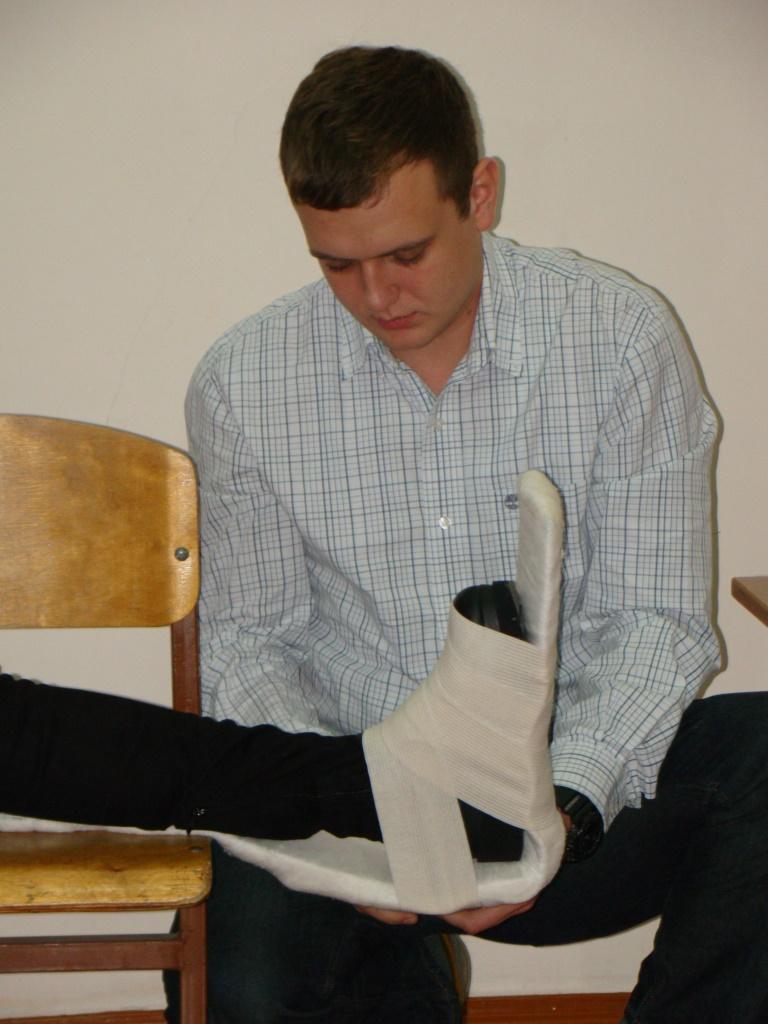 Слухачі сертифікатної освітньої програми під керівництвом лікаря спробували накладати шинну пов’язку на пошкоджену частину тіла.