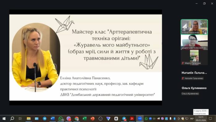 🎓 Спікеркою майстер-класу стала Елліна Анатоліївна Панасенко, доктор педагогічних наук, професор, завідувачка кафедри практичної психології ДВНЗ «Донбаський державний педагогічний університет» — відома науковиця та дослідниця у сфері психологічної допомоги, арттерапевтичних практик і психолого-педагогічного супроводу дітей у складних життєвих обставинах.