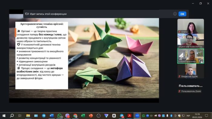 ✂️ Практична частина майстер-класу була присвячена опануванню арттерапевтичної техніки оригамі «Журавель мого майбутнього», що поєднує символічну творчість, рефлексію та психологічне відновлення. Учасники не лише ознайомилися з теоретичними засадами застосування техніки, а й долучилися до виконання творчого завдання, спрямованого на формування образу мрії, сили та життєстійкості.