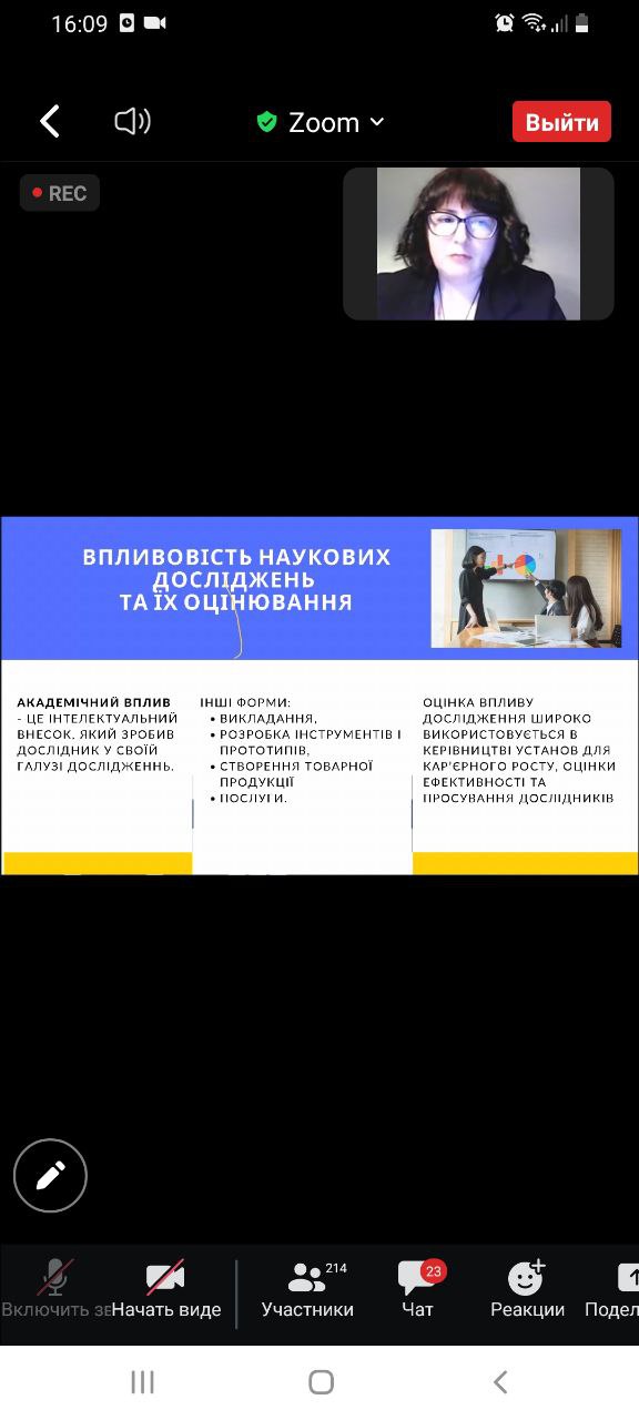 Учасники програми мали змогу ознайомитися з особливостями підтримування в актуальному стані власних цифрових профілів вченого у міжнародних наукометричних базах, розглянути принципи академічної доброчесності та їх роль у формуванні іміджу вченого.