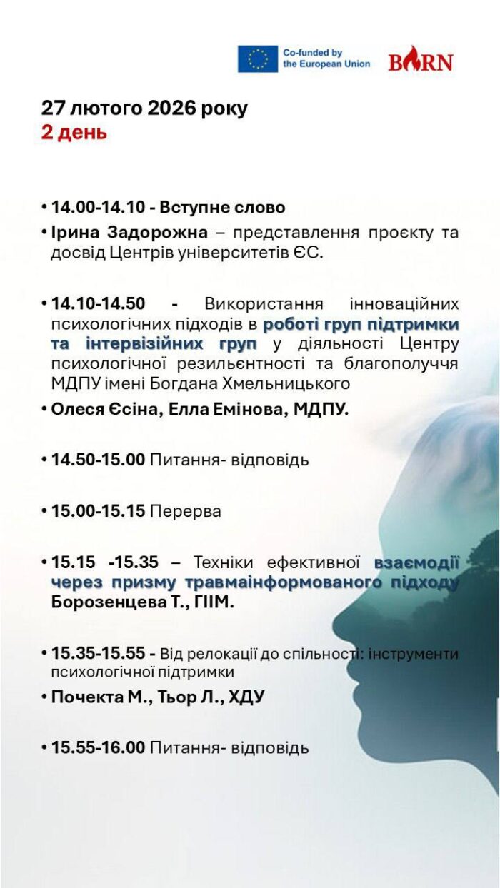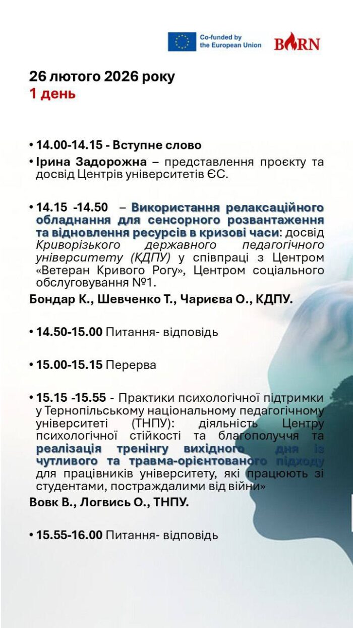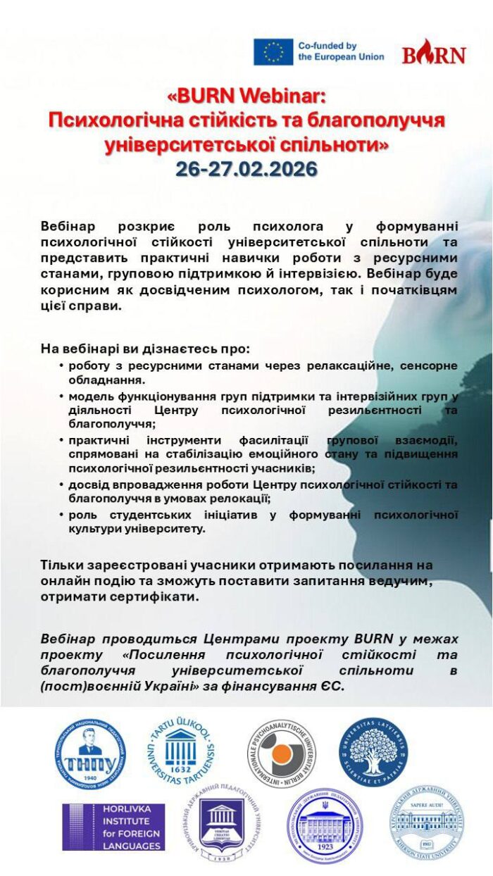 💡🌍 У межах вебінару учасники ознайомляться з досвідом реалізації міжнародного грантового проєкту Erasmus+ BURN, практиками функціонування університетських центрів психологічної підтримки та сучасними інструментами формування психологічної стійкості академічної спільноти.