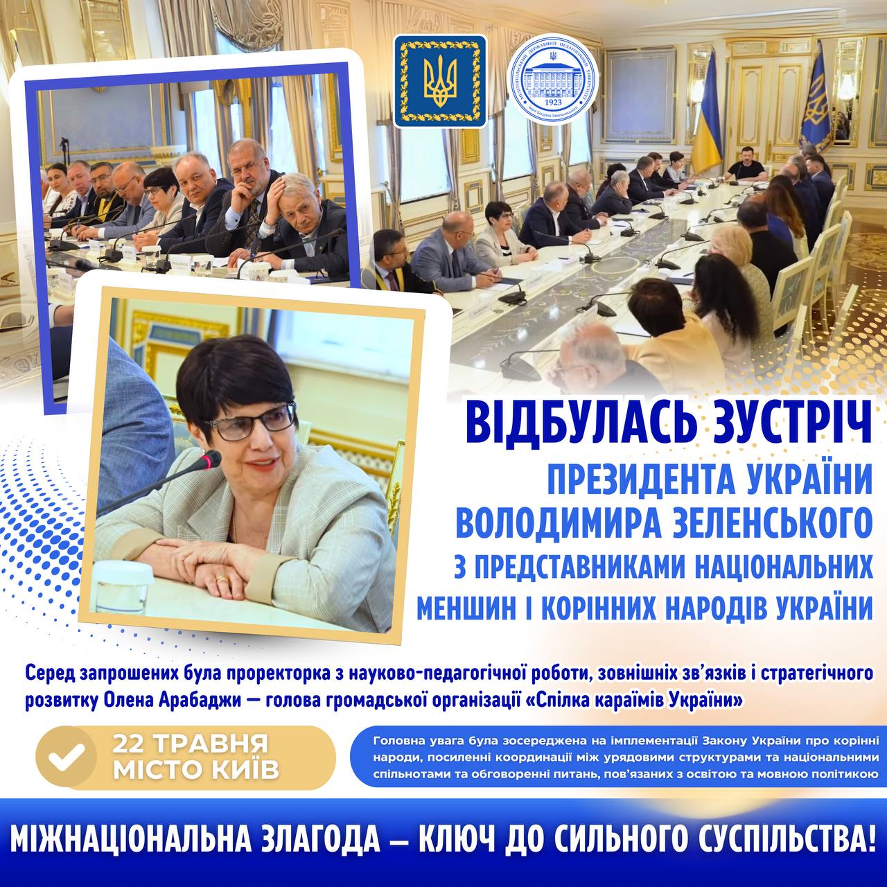 🏛️🙋🏻♂️22 травня Президент України Володимир Зеленський провів зустріч із представниками національних меншин і корінних народів України. 👏🏻🇺🇦Глава держави привітав присутніх із Днем міжнаціональної злагоди та культурного розмаїття, наголосивши на важливій ролі національних спільнот у різних сферах суспільного життя. Президент подякував їм за вагомий внесок у захист України. ✅📃Головна увага під час зустрічі була зосереджена на […]