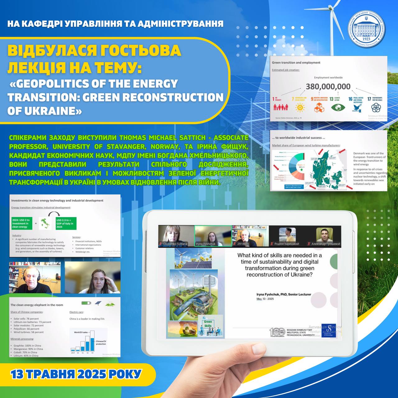 💻📚13 травня 2025 року на кафедрі управління та адміністрування МДПУ імені Богдана Хмельницького відбулася гостьова лекція на тему: «Geopolitics of the energy transition: green reconstruction of Ukraine». 🎓⭐️Спікерами заходу виступили Thomas Michael Sattich – Associate Professor, University of Stavanger, Norway, та Ірина Фищук, кандидат економічних наук, МДПУ імені Богдана Хмельницького. Вони представили результати спільного дослідження, […]