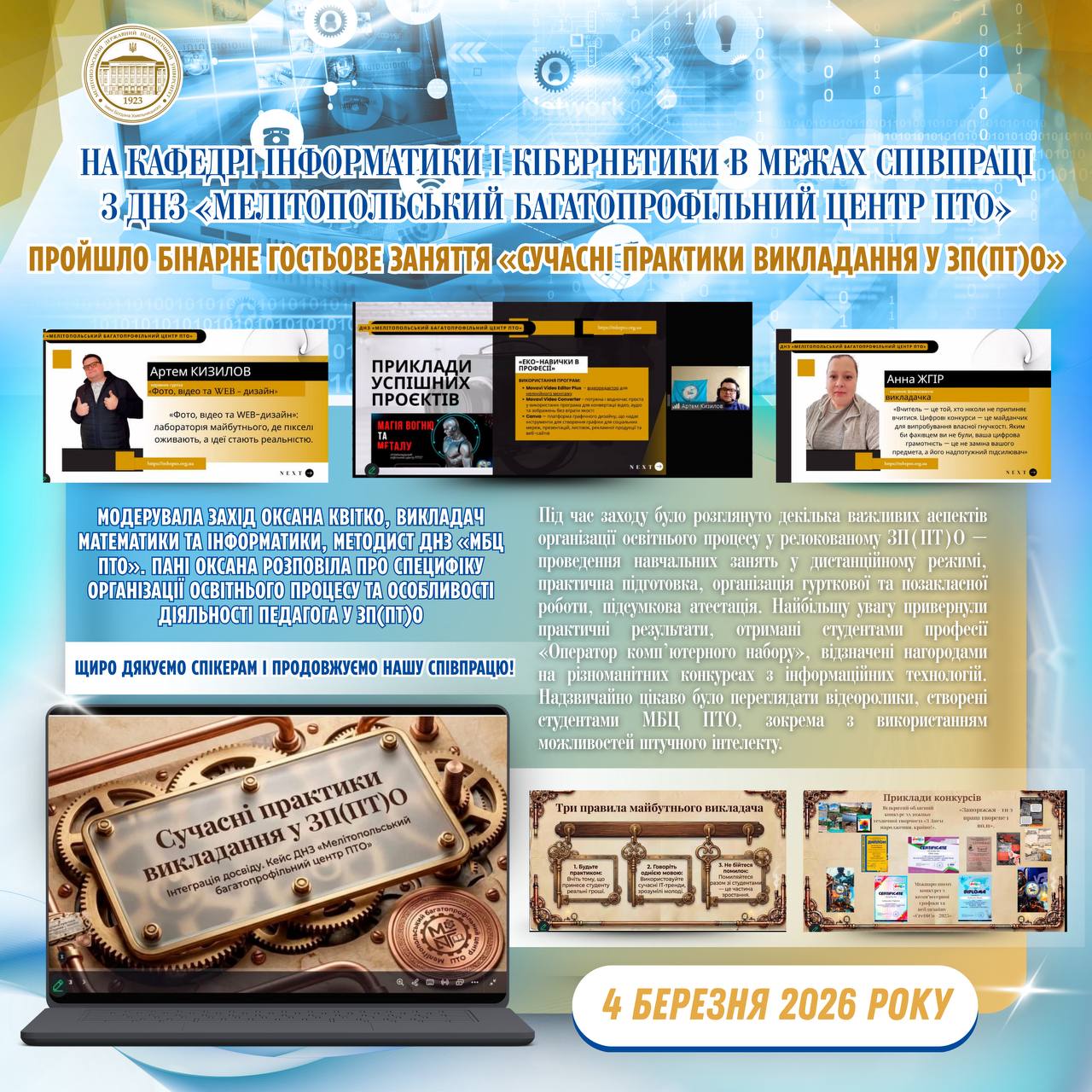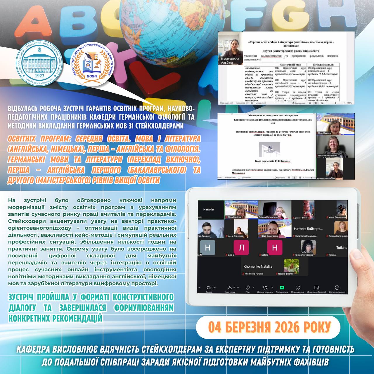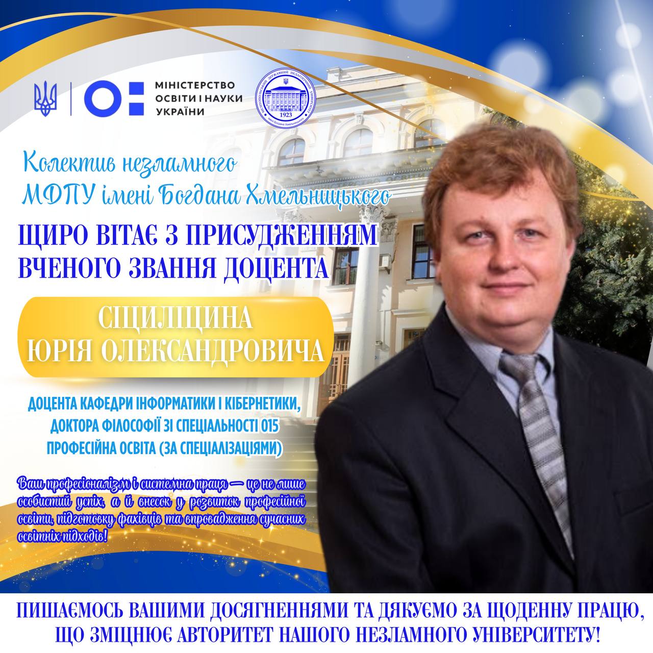 👨🏼🎓👏🏻 Колектив Мелітопольського державного педагогічного університету імені Богдана Хмельницького щиро вітає Сіциліцина Юрія Олександровича, доцента кафедри інформатики і кібернетики, із важливою подією у професійній кар’єрі — присвоєнням вченого звання доцента. 📄✅ Рішення прийняте вченою радою закладу вищої освіти та затверджене відповідно до наказу Міністерства освіти і науки України від 26.02.2026 № 375 «Про затвердження рішень […]