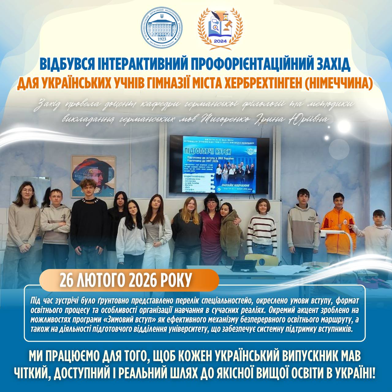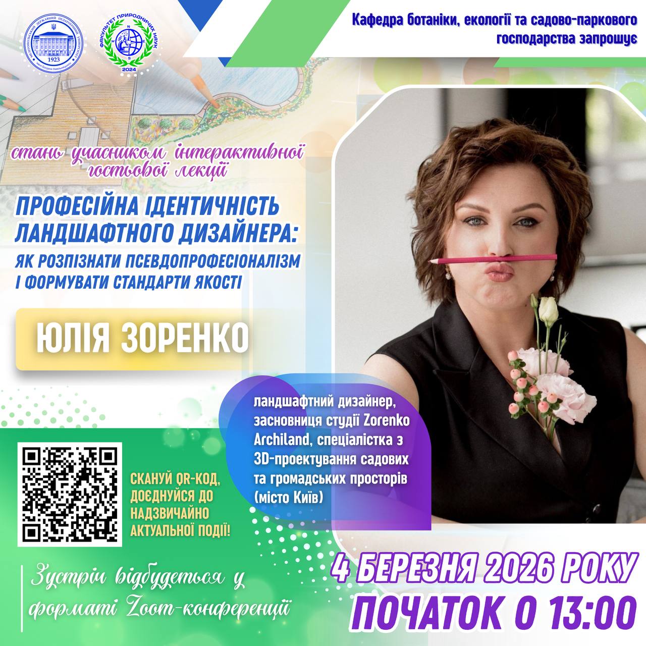 🏛️🇺🇦 Кафедра ботаніки, екології та садово-паркового господарства запрошує на інтерактивну гостьову лекцію за участі практикуючого фахівця — Юлії Зоренко, ландшафтної дизайнерки, засновниці студії Zorenko Archiland, спеціалістки з 3D-проєктування садових і громадських просторів (м. Київ). 📅 4 березня о 13:00💻 Онлайн (Zoom)https://us02web.zoom.us/j/87613526401?pwd=yXRxSqrcMkfClfMXaB1TXbPON86bIi.1 Meeting ID: 876 1352 6401Passcode: 641851 🤝🏻Під час лекції йтиметься про:✅критерії професійної компетентності ландшафтного […]