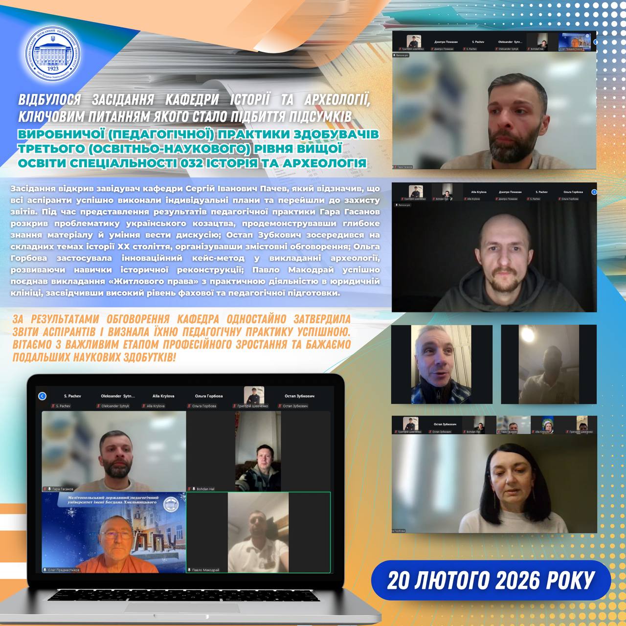 ✅🏛 20 лютого відбулося засідання кафедри історії та археології, ключовим питанням якого стало підбиття підсумків виробничої (педагогічної) практики здобувачів третього (освітньо-наукового) рівня вищої освіти спеціальності 032 Історія та археологія. 👨🏼🎓🇺🇦 Відкрив засідання завідувач кафедри Сергій Іванович Пачев, який зазначив, що всі аспіранти успішно та в повному обсязі виконали затверджені плани-графіки, і запропонував перейти до найцікавішого […]