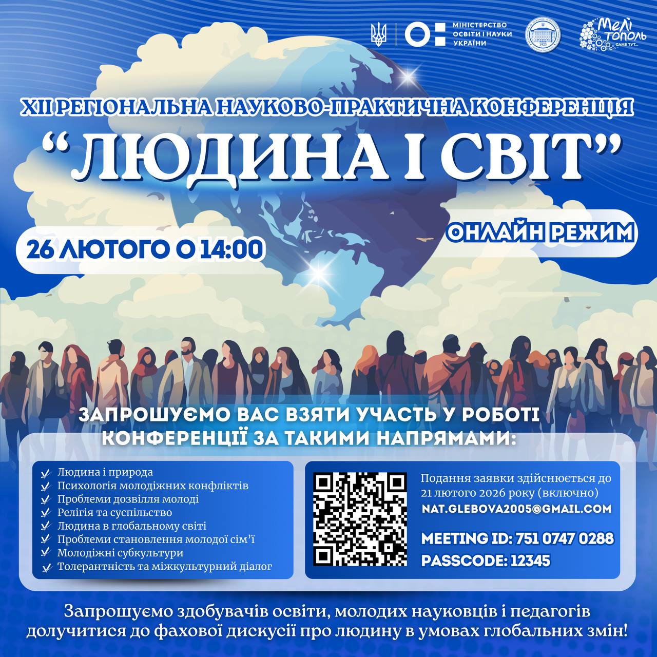🏛️💫Мелітопольський державний педагогічний університет імені Богдана Хмельницького запрошує взяти участь у ХІІ регіональній науково-практичний конференції «ЛЮДИНА І СВІТ»! 📝Напрями роботи конференції:🔻Людина і природа.🔻Психологія молодіжних конфліктів.🔻Проблеми дозвілля молоді.🔻Релігія та суспільство.🔻Людина в глобальному світі.🔻Проблеми становлення молодої сім’ї.🔻Молодіжні субкультури.🔻Толерантність та міжкультурний діалог. 🗓️✅ Захід відбудеться 26 лютого 2026 року о 14:00 👨🏻💻🔗 У віртуальному залі Zoom-відеоконференціїhttps://us04web.zoom.us/j/75107470288?pwd=c8fIa9385LKqUZ8rEo7aR7Nw3nDfmO.1📍🇺🇦Ідентифікатор конференції: 751 […]