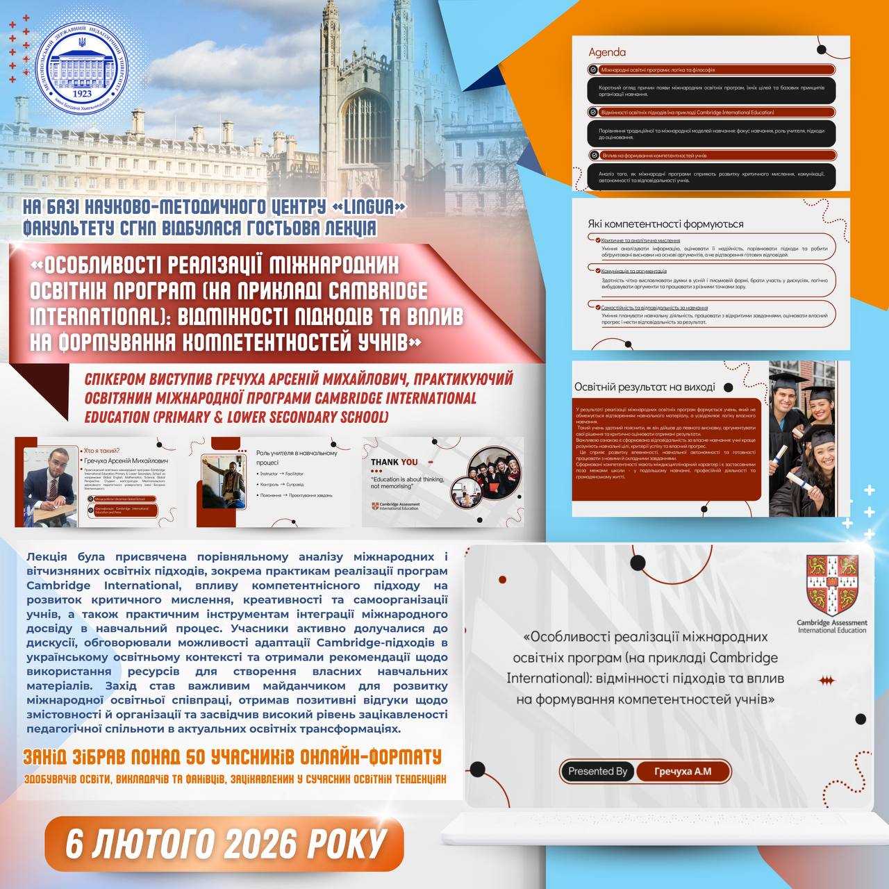 📅 6 лютого 2026 року на факультеті суспільно-гуманітарних наук та права на базі науково-методичного центру «Lingua» відбулася гостьова лекція на тему«Особливості реалізації міжнародних освітніх програм (на прикладі Cambridge International): відмінності підходів та вплив на формування компетентностей учнів». 👥 Захід об’єднав понад 50 учасників в онлайн-форматі — здобувачів освіти, викладачів і фахівців, зацікавлених у сучасних міжнародних […]