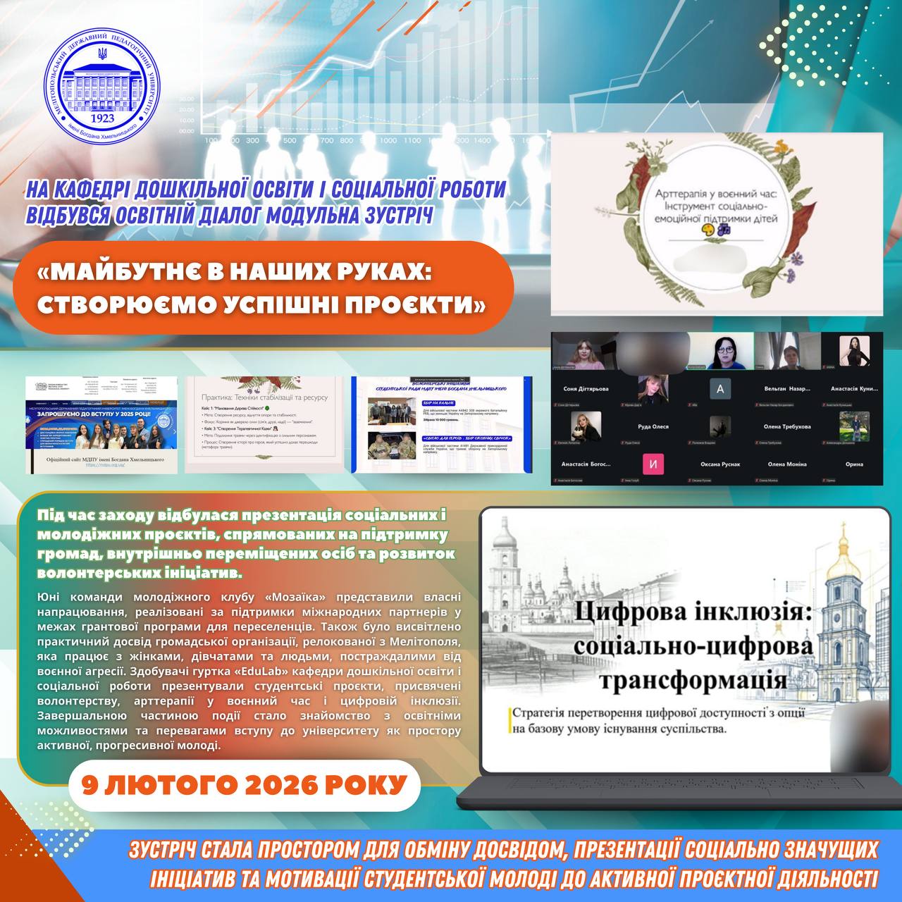 📅✊🏻 9 лютого 2026 року відбулася модульна зустріч «Майбутнє в наших руках: створюємо успішні проєкти». Організаторами події виступили кафедра дошкільної освіти і соціальної роботи, гурток «EduLab», а також запрошені спікери з громадських організацій Година для України, молодіжного клубу Мозаїка, Центр «Побратим» та Крим_SOS. 🚀 Свої проєкти презентували Пилявська, Медведківська та Трибухівська юні команди молодіжного клубу […]