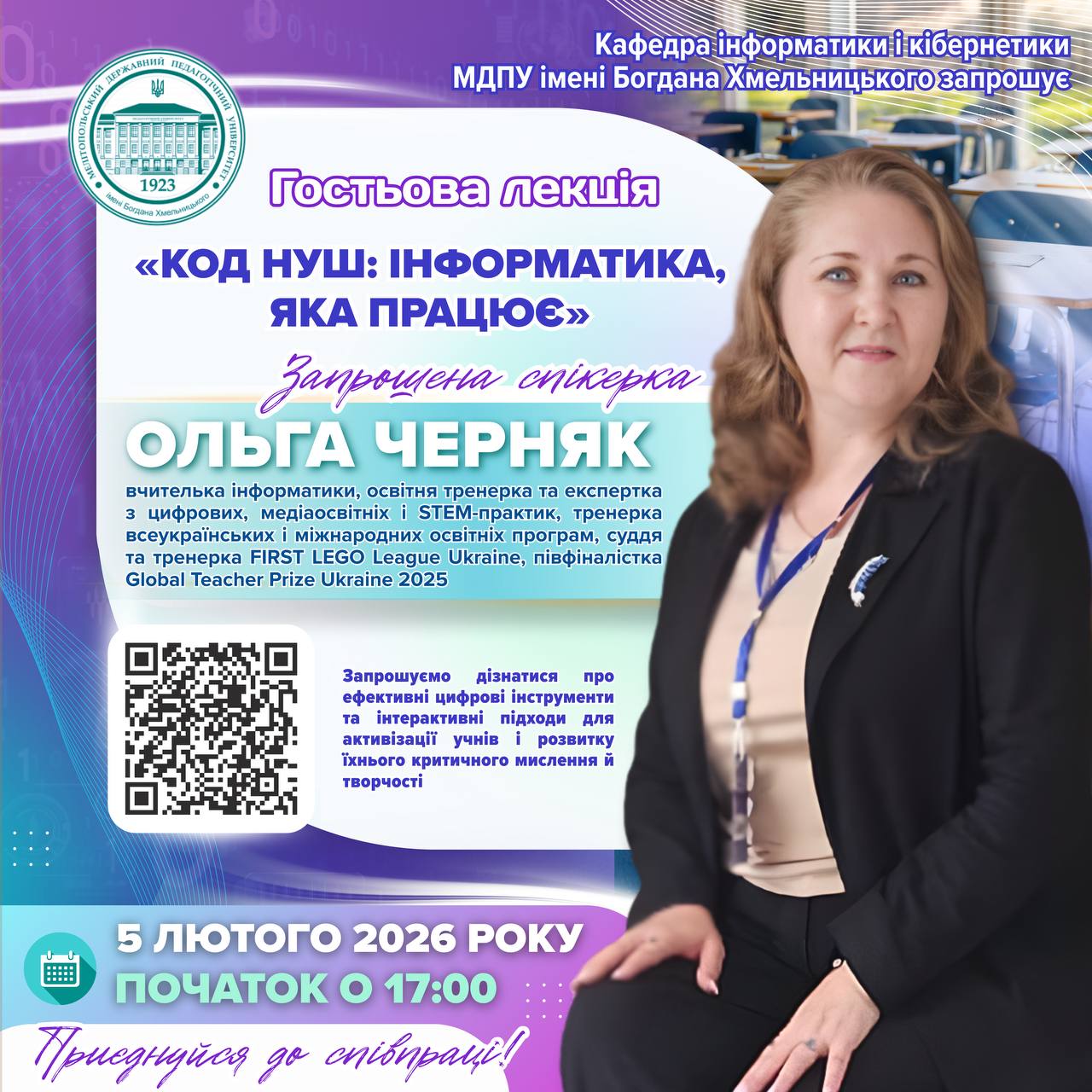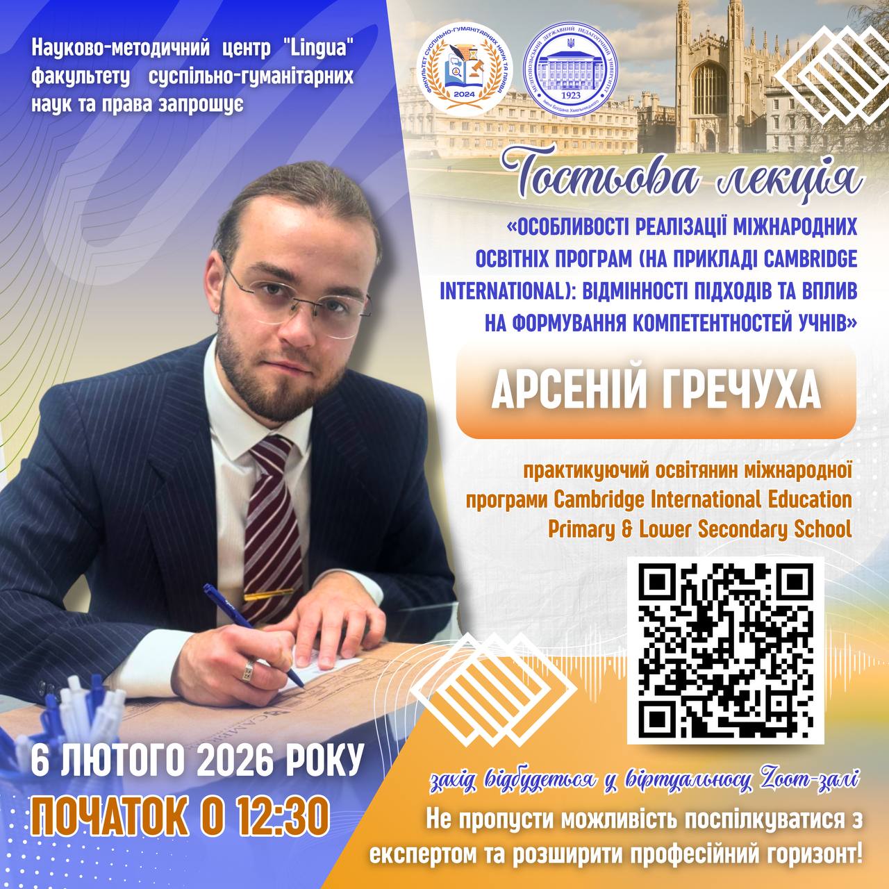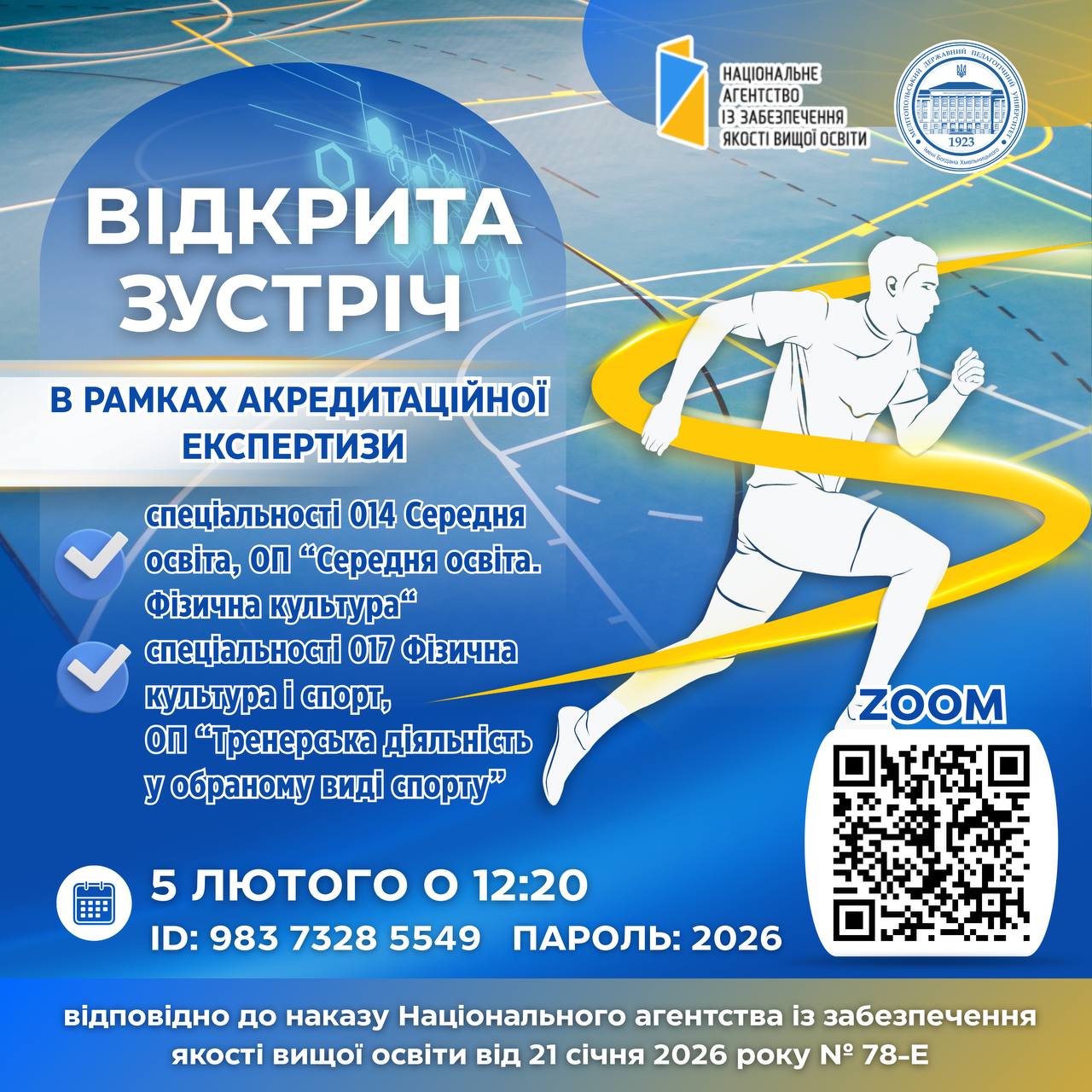 ✅👩🏼🏫 4–6 лютого 2026 року, відповідно до наказу Національне агентство із забезпечення якості вищої освіти від 21 січня 2026 року № 78-Е, відбудеться акредитаційна експертиза освітніх програм: 🔺 ID 28870 — ОП «Середня освіта. Фізична культура»🔺 ID 56455 — ОП «Тренерська діяльність в обраному виді спорту» 👩🏼💻🇺🇦 Запрошуємо всіх бажаючих долучитися до відкритої зустрічі в […]