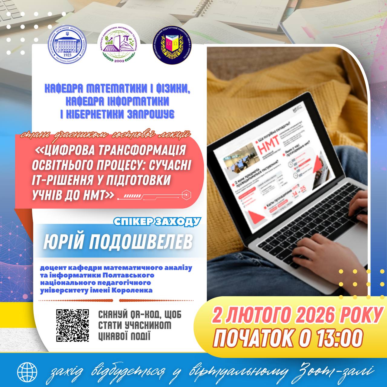 📢🇺🇦Кафедра математики і фізики та кафедра інформатики і кібернетики запрошують здобувачів освіти, викладачів і всіх зацікавлених на гостьову лекцію «Цифрова трансформація освітнього процесу: сучасні ІТ-рішення у підготовці учнів до НМТ». 👨🏫 Лекцію читатиме Подошвелев Юрій Георгійович, доцент кафедри математичного аналізу та інформатики Полтавського національного педагогічного університету імені В. Г. Короленка. 🗓 Дата: 2 лютого 2026 […]