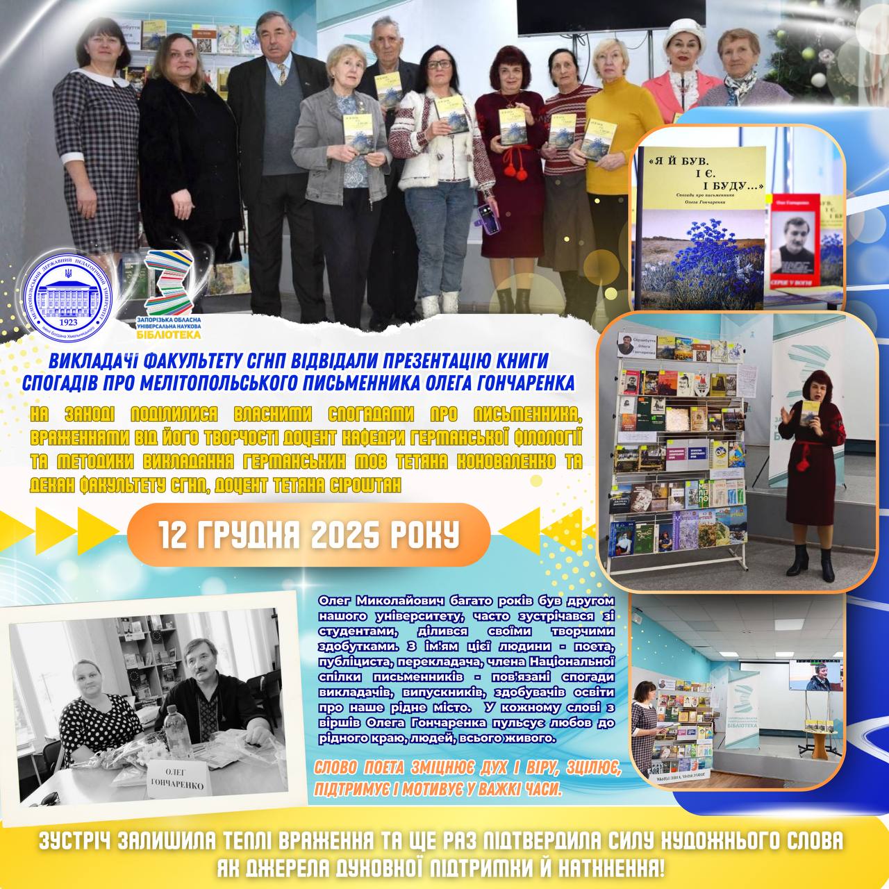 📚 12 грудня 2025 року викладачі факультету СГНП відвідали презентацію книги спогадів про мелітопольського письменника Олега Гончаренка, що відбулася у Запорізькій обласній науковій бібліотеці — подію щиру, світлу й глибоко зворушливу. 🕊 Олег Миколайович був не просто знаним поетом, публіцистом, перекладачем, членом Національної спілки письменників України — він багато років залишався другом нашого університету, людиною, […]