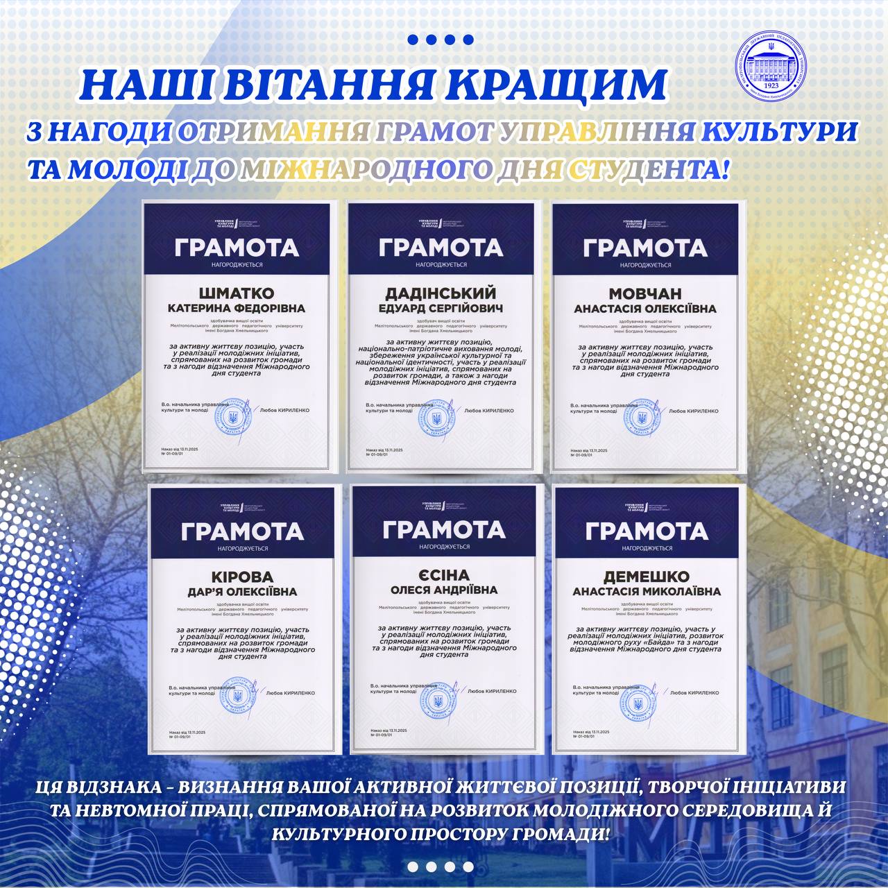 ⭐️📚За активну життєву позицію, участь у реалізації молодіжних ініціатив, спрямованих на розвиток громади, та з нагоди відзначення Міжнародного дня студента Грамотами Управління культури та молоді Мелітопольської міської ради Запорізької області нагороджуються талановиті та амбітні здобувачі Університету:✅🎓Шматко Катерина Федорівна✅🎓Дадінський Едуард Сергійович✅🎓Мовчан Анастасія Олексіївна✅🎓Кірова Дар’я Олексіївна✅🎓Єсіна Олеся Андріївна✅🎓Демешко Анастасія Миколаївна 👏🏻🚀Ви — голос активної молоді, яка не […]