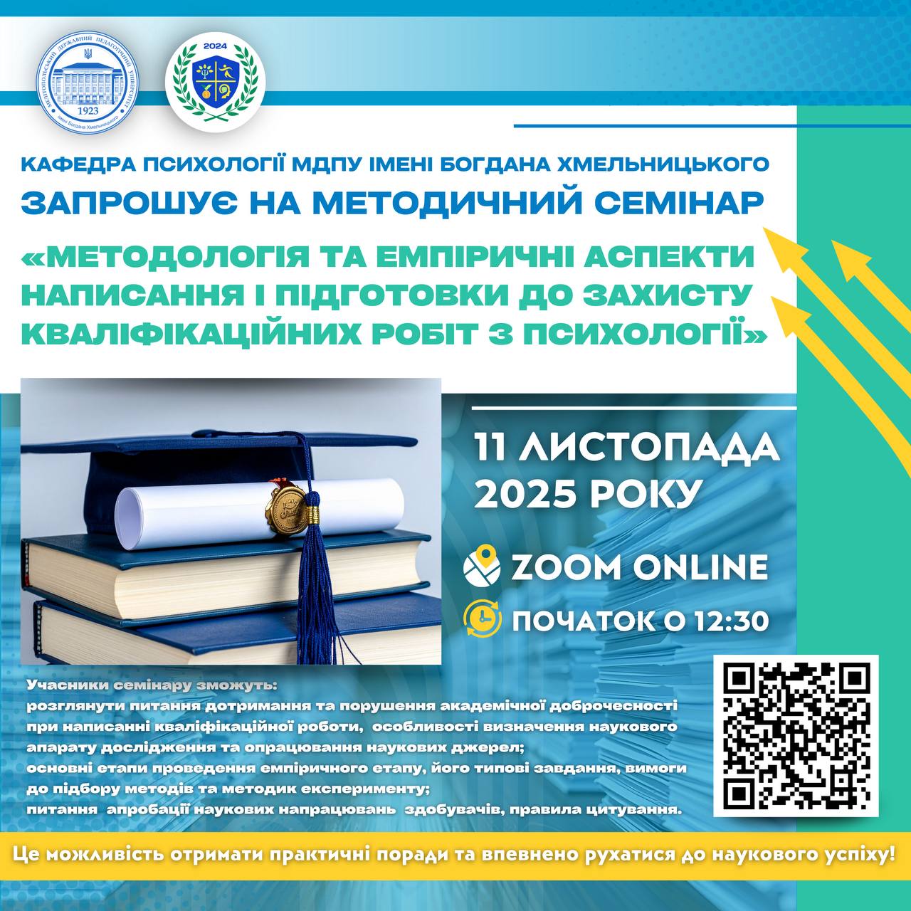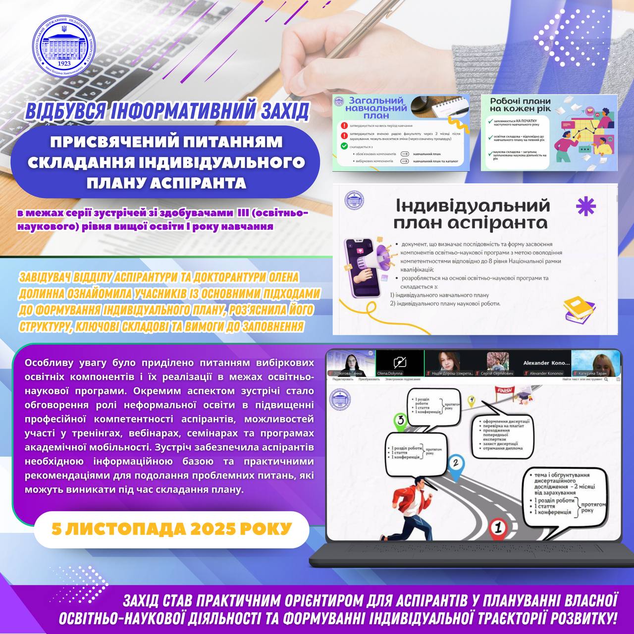 🏛️🙋🏻♂️5 листопада в межах серії зустрічей зі здобувачами ІІІ (освітньо-наукового) рівня вищої освіти І року навчання відбулася інформативний захід, присвячений питанням складання індивідуального плану аспіранта. 👩🏼🎓🇺🇦Завідувач відділу аспірантури та докторантури Олена ДОЛИННА ознайомила учасників із основними підходами до формування індивідуального плану, роз’яснила його структуру, ключові складові та вимоги до заповнення. Особливу увагу було приділено питанням […]