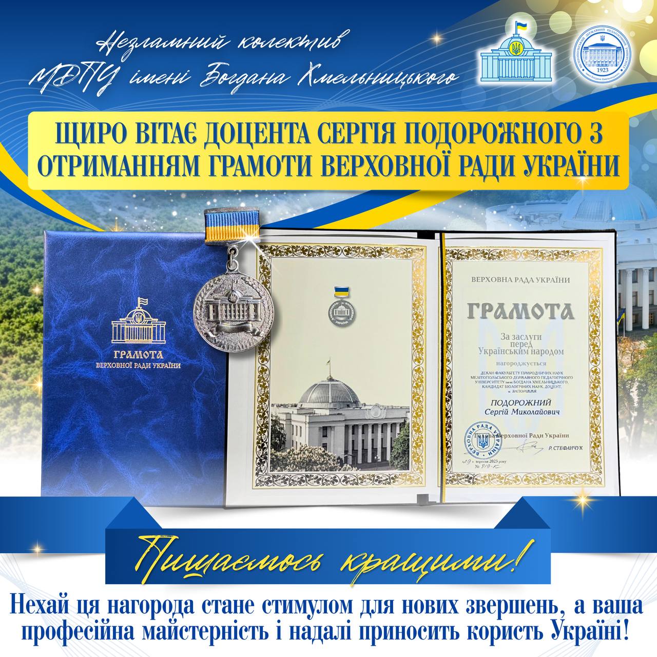 🏛️👏🏻Колектив Мелітопольського державного педагогічного університету імені Богдана Хмельницького щиро вітаєдекана факультету природничих наук, доцента Сергія Миколайовича Подорожного із високою державною нагородою — Грамотою Верховної Ради України! 🎓🌿 Цю почесну відзнаку присуджено за вагомий особистий внесок у розвиток вищої освіти України, багаторічну сумлінну працю, наукову та педагогічну майстерність, високий професіоналізм і громадянську позицію. 💙💛 Ваша щоденна […]