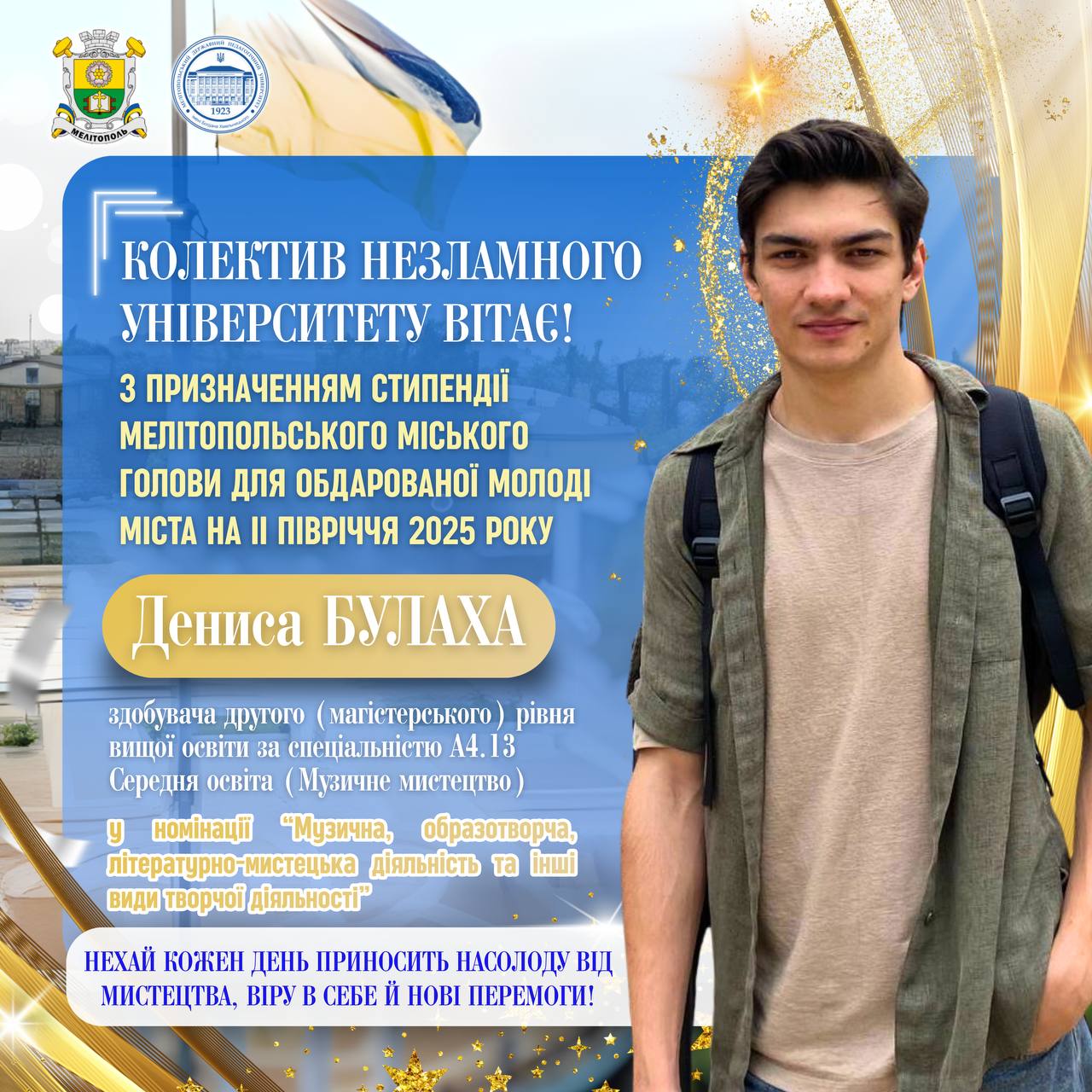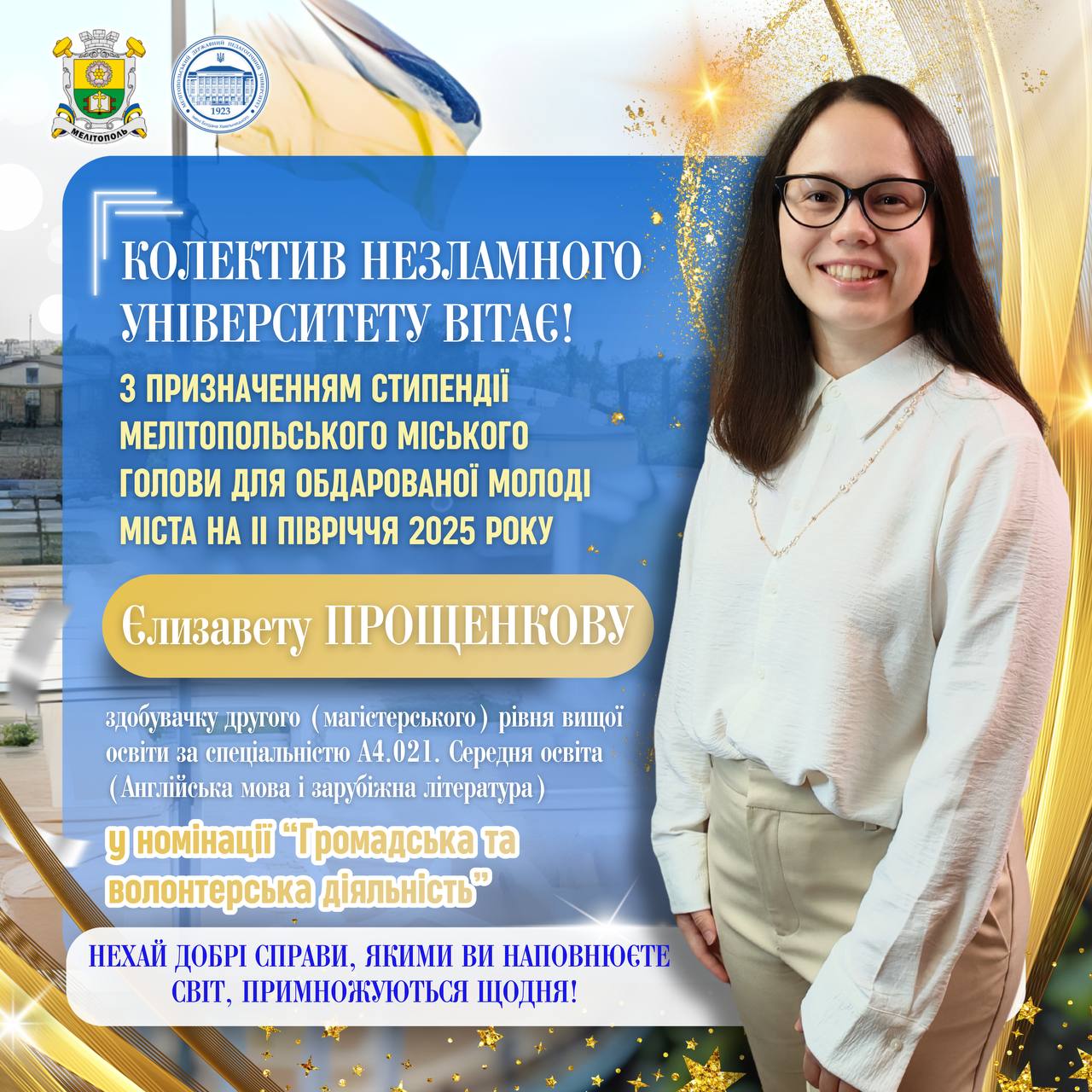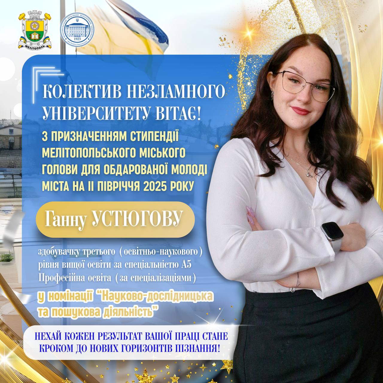 📚⭐️ Колектив Мелітопольського державного педагогічного університету імені Богдана Хмельницького щиро вітає УСТЮГОВУ ГАННУ ЕДУАРДІВНУ, здобувачку вищої освіти факультету інформатики, математики та економіки, ‼️💐 із призначенням стипендії Мелітопольського міського голови для обдарованої молоді міста (разова виплата) у номінації «Науково-дослідницька та пошукова діяльність»! 📝📌Відповідно до розпорядження Мелітопольського міського голови від 14.10.2025 № 99-р «Про затвердження списку молоді, […]