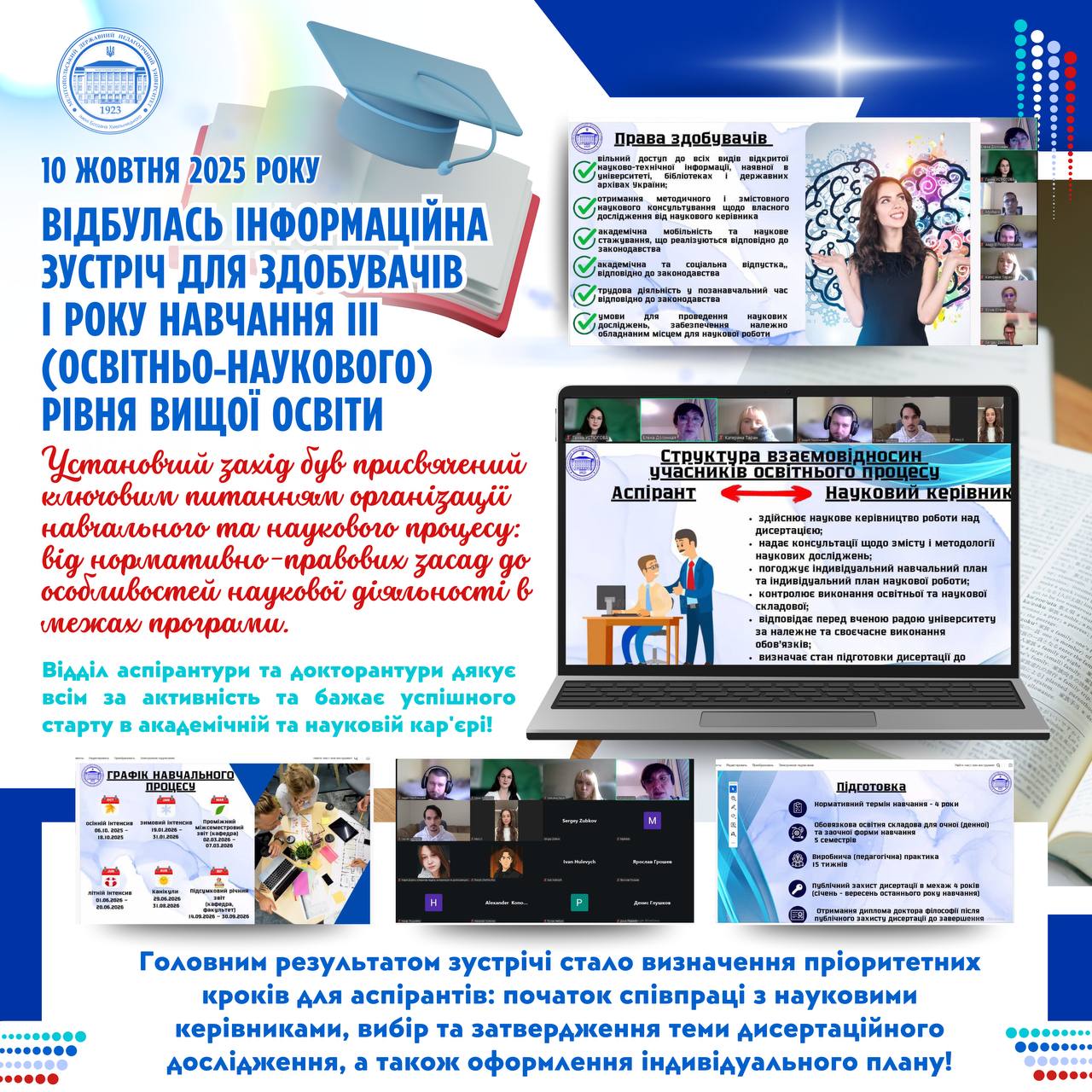 👩🏻💻‼️10 жовтня 2025 року відділ аспірантури та докторантури, в особі завідувачки Олени Долинної, провів інформаційну зустріч для здобувачів І року навчання ІІІ (освітньо-наукового) рівня вищої освіти. ✅⭐️Це була друга зустріч із серії, присвяченої адаптації першокурсників, першу з яких провела директор Центру освітніх дистанційних технологій Альона Чорна, ознайомивши здобувачів з роботою дистанційної платформи для навчання. 👩🏼🎓📌Установчий […]