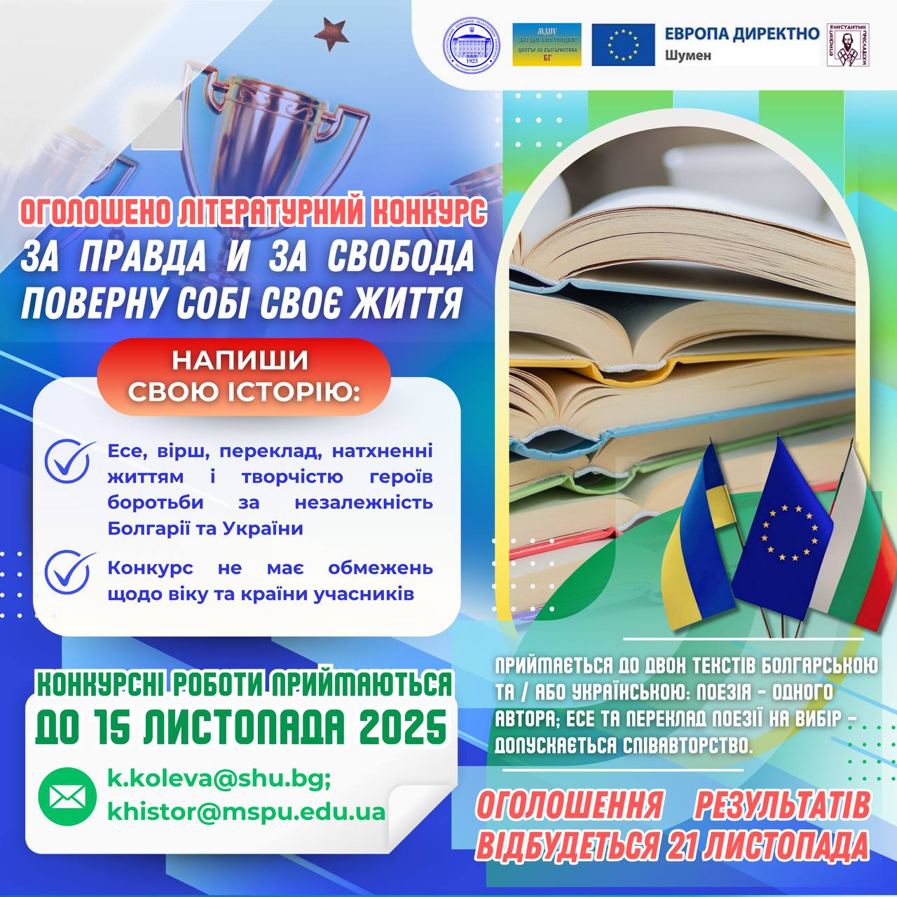 🌍🇧🇬 Центр болгаристики з лекторатом болгарської мови, літератури та культури, МДПУ імені Богдана Хмельницького, Шуменський університет імені єпископа Костянтина Преславського та Центр «Європа безпосередньо» – Шумен📢‼️ ОГОЛОШУЮТЬ літературний конкурс НА ЕСЕ, ВIРШ, ПЕРЕКЛАД,натхненнi життям i творчiстю героїв боротьби за незалежнiсть Бoлгарiї та України! 👫⁉️ Хто може брати участь?➡️ Конкурс не має жодних обмежень за віком […]