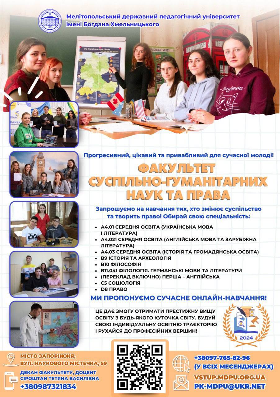 📚⚖️Факультет суспільно-гуманітарних наук та права – це мультидисциплінарне сучасне освітнє середовище, що сприяє формуванню загальних і професійних компетентностей майбутніх фахівців у галузях історичних, філологічних, соціологічних наук та права задля розбудови нашої держави! 🏛️🇺🇦Наразі факультет представлений кафедрами:✏️ історії та археології;✏️ германської філології та методики викладання германських мов;✏️ української філології та зарубіжної літератури;✏️ права;✏️ соціології та філософії. […]