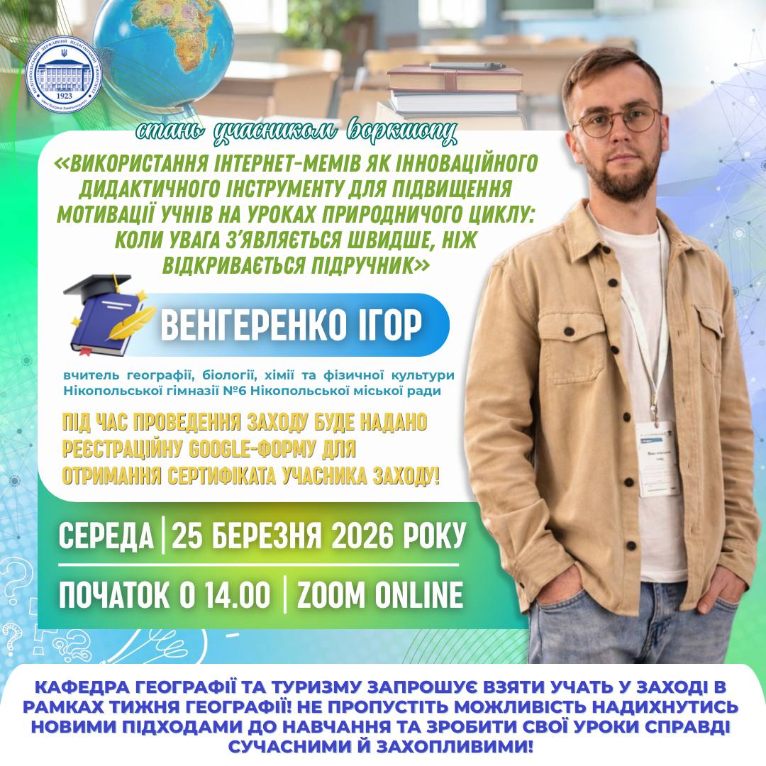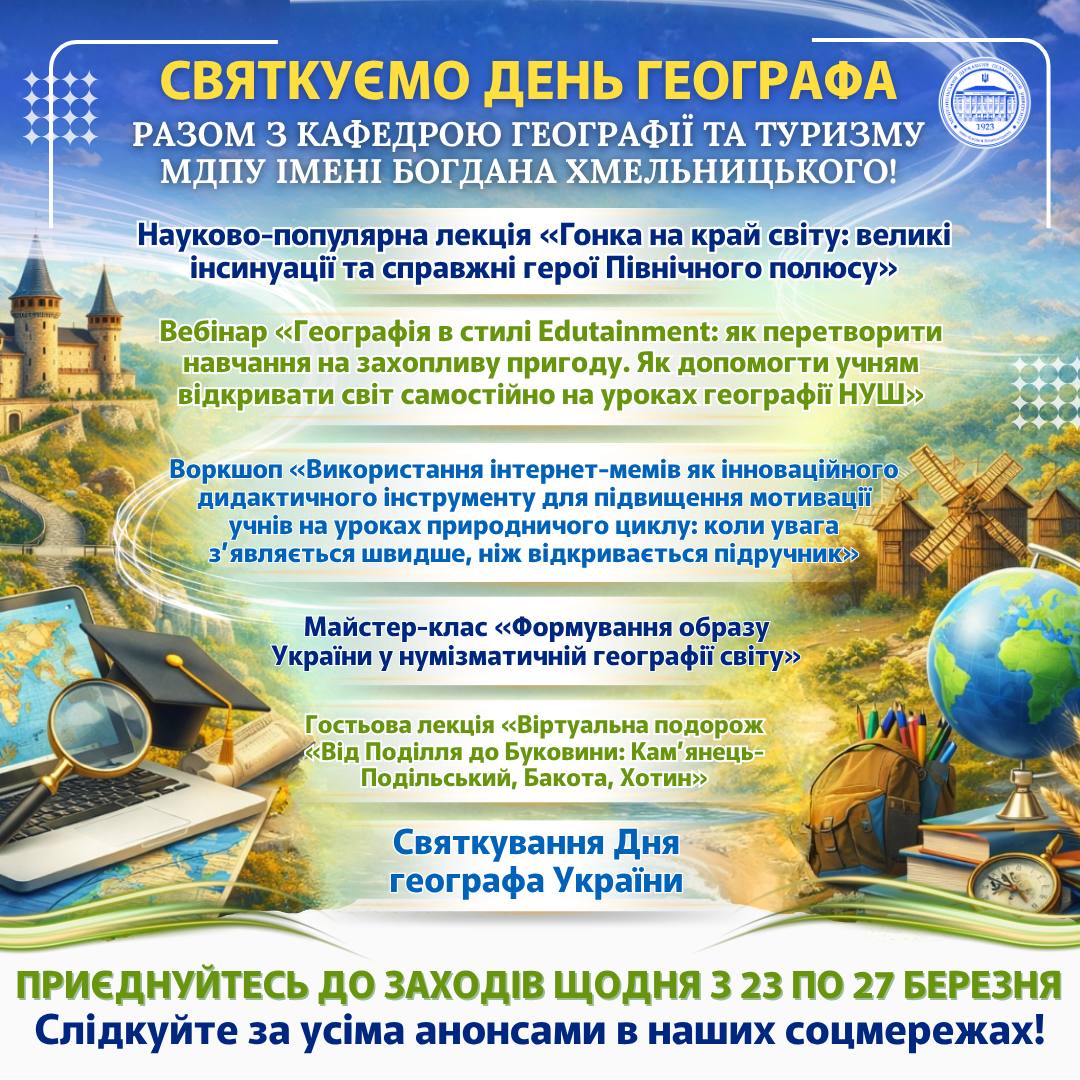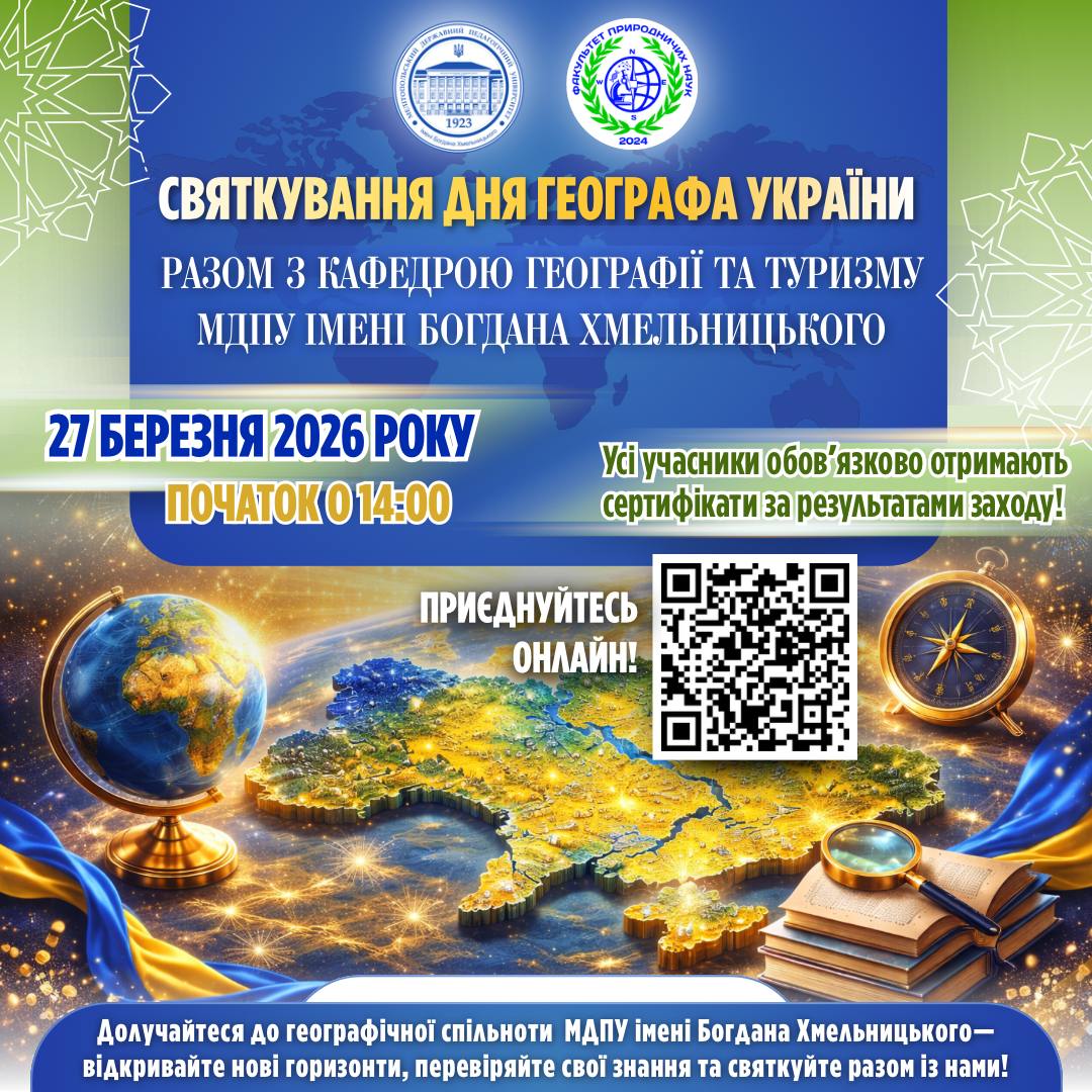 💥🥳До Дня географа України 2026 кафедра географії та туризму Мелітопольського державного педагогічного університету імені Богдана Хмельницького запрошує усіх бажаючих на яскраве та динамічне святкування! ✅🏛На Вас чекають урочистий захід, видовищний географічний флешмоб і захоплива інтелектуальна Kahoot-вікторина, де найкмітливіші здобудуть цінні нагороди! 📅💫27 березня 2026 року о 14:00 ми зустрінемося у ZOOM-відеоконференції, щоб разом відзначити це […]