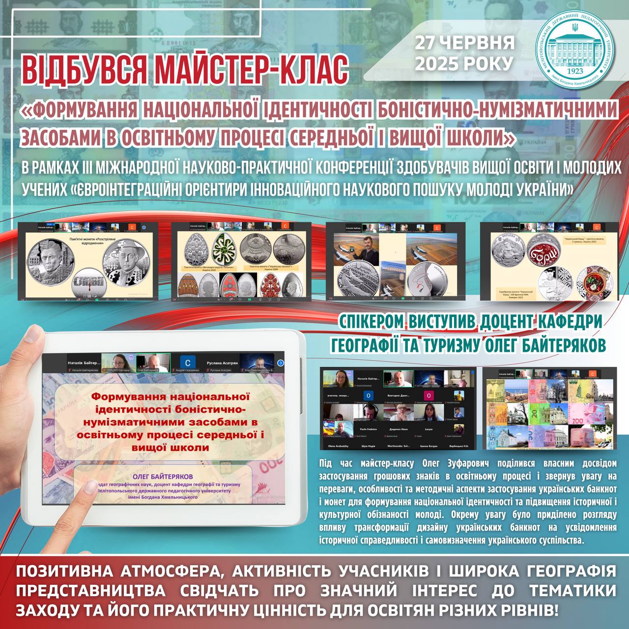👨🏼🎓🗺️ 27 червня 2025 року доцентом кафедри географії та туризму Олегом Байтеряков в рамках IIІ Міжнародної науково-практичної конференції здобувачів вищої освіти і молодих учених «Євроінтеграційні орієнтири інноваційного наукового пошуку молоді України» було проведено майстер-клас на тему: «Формування національної ідентичності боністично-нумізматичними засобами в освітньому процесі середньої і вищої школи». 🌍👏🏻Учасниками майстер-класу стали співробітники, викладачі та здобувачі […]