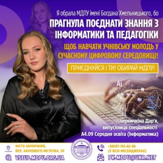 💬💻 “Я обрала МДПУ, бо прагнула поєднати знання з інформатики та педагогіки, щоб навчати учнів у сучасному цифровому середовищі. Тут я зросла як фахівчиня, як науковиця, як особистість. Це університет, що відкрив мені дорогу до дійсно якісної освіти й великої мети — змінювати світ через знання.”