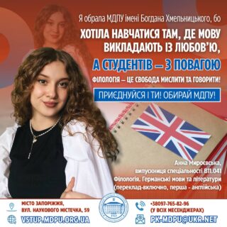💬🌍 «Я обрала МДПУ імені Богдана Хмельницького, бо хотіла навчатися там, де мову викладають із любов’ю, а студентів — з повагою. Переклад — це більше, ніж слова. Це міст між культурами. І саме тут я зрозуміла: філологія — це свобода мислити, говорити й змінювати світ через слово».