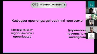 На факультеті інформатики, математики та економіки пройшов день відкритих дверей засобами віддаленого відео зв’язку. Кафедри факультету запросили на зустріч старшокласників шкіл міста та регіону. Присутніми на зум-конференції також були здобувачі бакалаврату, адже майже кожна спеціальність факультету може запропонувати освіту на рівні магістратури. До потенційних абітурієнтів університету звернулися завідувачі кафедр, провідні викладачі із розповідями про особливості освіти на спеціальностях та перспективами працевлаштування, знання яких може допомогти молодій людині утвердитися в думці про необхідність здобуття вищої освіти та вибрати майбутню професію. Інформацію про освітні програми кафедри факультету доносили із допомогою трансляції презентацій, відеороликів, он-лайн демонстрації навчальних лабораторій із сучасним спеціалізованим обладнанням.