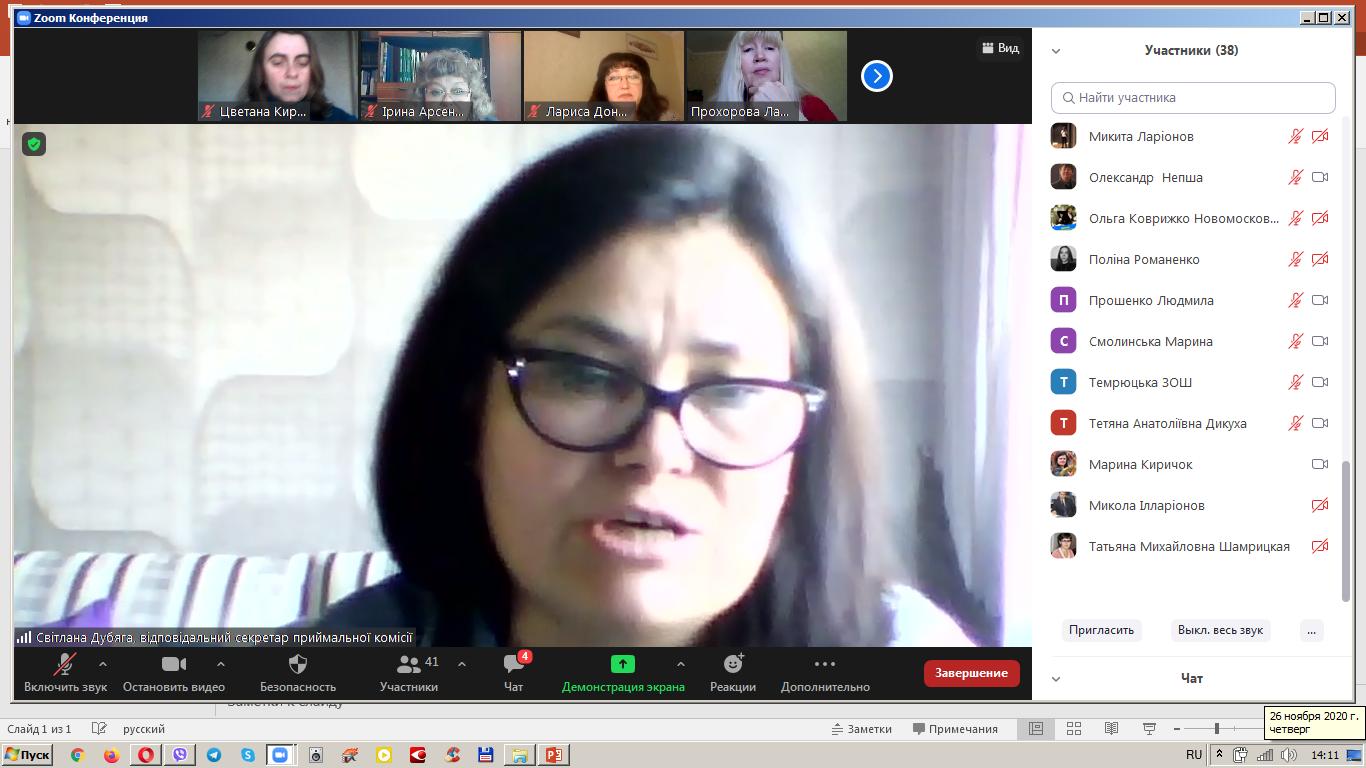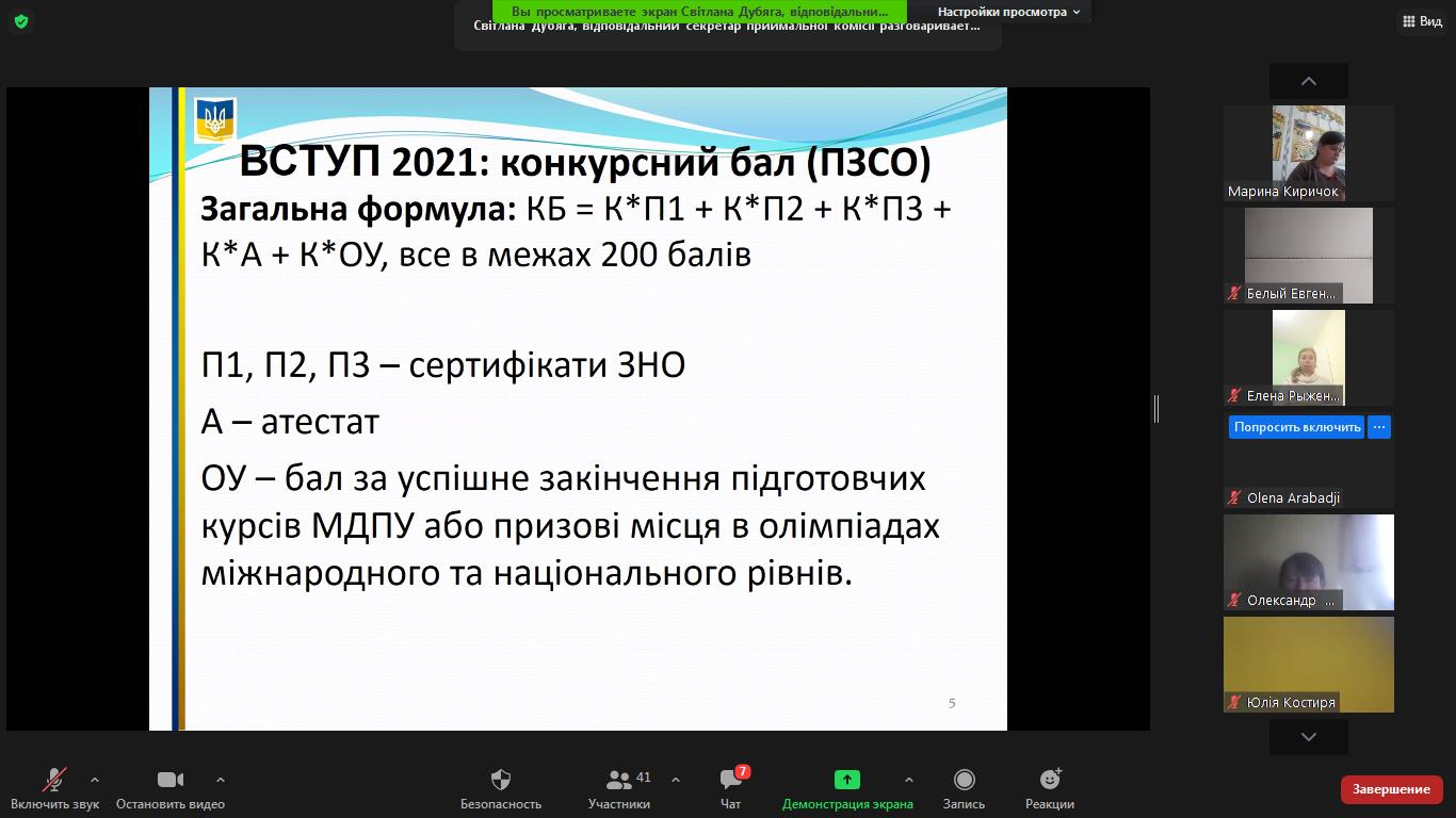 Проректор із заочної форми навчання доц. Арабаджи О.С. привітала учасників зустрічі від імені адміністрації вишу і запросила випускників на навчання до університету. Декан природничо-географічного факультету доц. Донченко Л.М. ознайомила гостей заходу з історією та спеціальностями факультету, матеріально-технічною базою, напрямами наукової роботи, можливостями практичної підготовки в Україні та за кордоном. Заступник декана з виховної роботи та начальних практик доц. Топалова О.І. розповіла присутнім про бази навчальних та виробних практик і дозвілля здобувачів в стінах факультету та студентських гуртожитках. Завідувачі випускових кафедр доц. Арсененко І.А. та доц. Прохорова Л.А. детально ознайомили учасників зустрічі з особливостями вступу та навчання на кожній спеціальності факультету. Відповідальний секретар приймальної комісії доц. Дубяга С.М. висвітлила основні положення Правил Прийому до університету у 2021 році. Наприкінці зустрічі відповідальна за профорієнтаційну роботу на природничо-географічному факультеті ст. викл. Іванова В.М. подякувала усім учасникам за приділений час та зацікавленість до нашого навчального закладу.