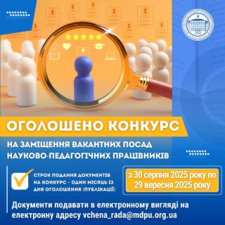 🏛️📣МДПУ імені Богдана Хмельницького оголошує конкурс на заміщення вакантних посад науково-педагогічних працівників з 30 серпня 2025 року по 29 вересня 2025 року!
