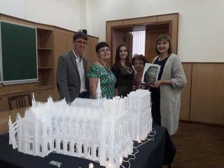 Анна Брянцева розповіла, що ці два красені-собори Олександр Брянцев вирізав і зібрав із звичайнісінького офісного паперу, єдиною особливістю якого є підвищена щільність, але зауважила, що, хай ущільнений, але це все одно папір, а не картон. «Картон не підійшов для нашого проекту через свою певну грубість», — зауважила Анна. Саме завдяки витонченості паперу вдалося передати ажурність готичних соборів, їх містичну експресію, довершені форми. Далі Олександр Брянцев продемонстрував, як спрощена модель Нотр-Дам, разом з моделями Ейфелевої вежі і Тріумфальної арки було використано в оформленні книги-іграшки «Мандруємо світом. Париж». Анна Брянцева звернулася до вчителів в аудиторії з пропозицією використовувати подібні техніки у роботі з учнями і розповіла, що вже є подібний досвід в процесі співпраці викладачів кафедри із учителями м. Мелітополя.