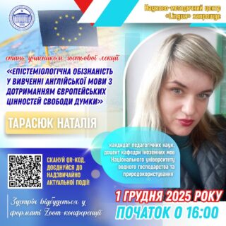 👩🏼‍🎓🎙️Спікер – Тарасюк Наталія, кандидат педагогічних наук, доцент кафедри іноземних мов Національного університету водного господарства та природокористування (м. Рівне).