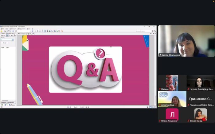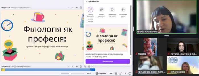 👩🏼🎓📚 Лекторка, кандидатка філологічних наук, доцентка комунального закладу вищої освіти «Хортицька національна навчально-реабілітаційна академія» Запорізької обласної ради, співзасновниця мовного центру “Eureka”, сертифікована інструкторка з міжнародних іспитів, редакторка, перекладачка Ксенія Чумакова ознайомила присутніх з особливостями побудови власної академічної траєкторії та ключовими аспектами вибору напрямів професійного розвитку у сфері перекладацької діяльності.