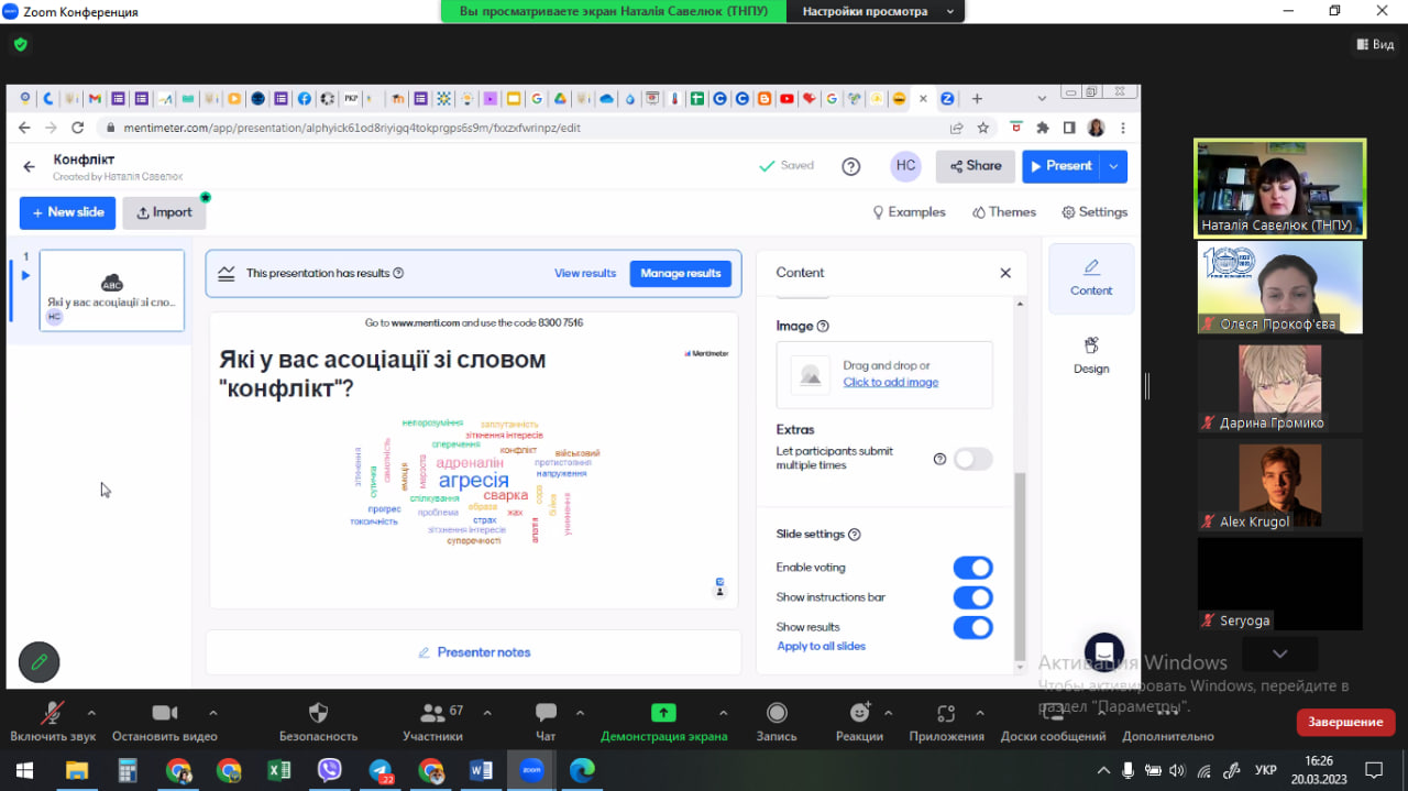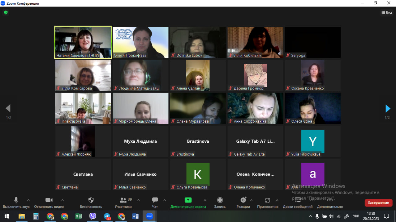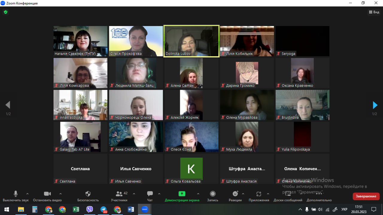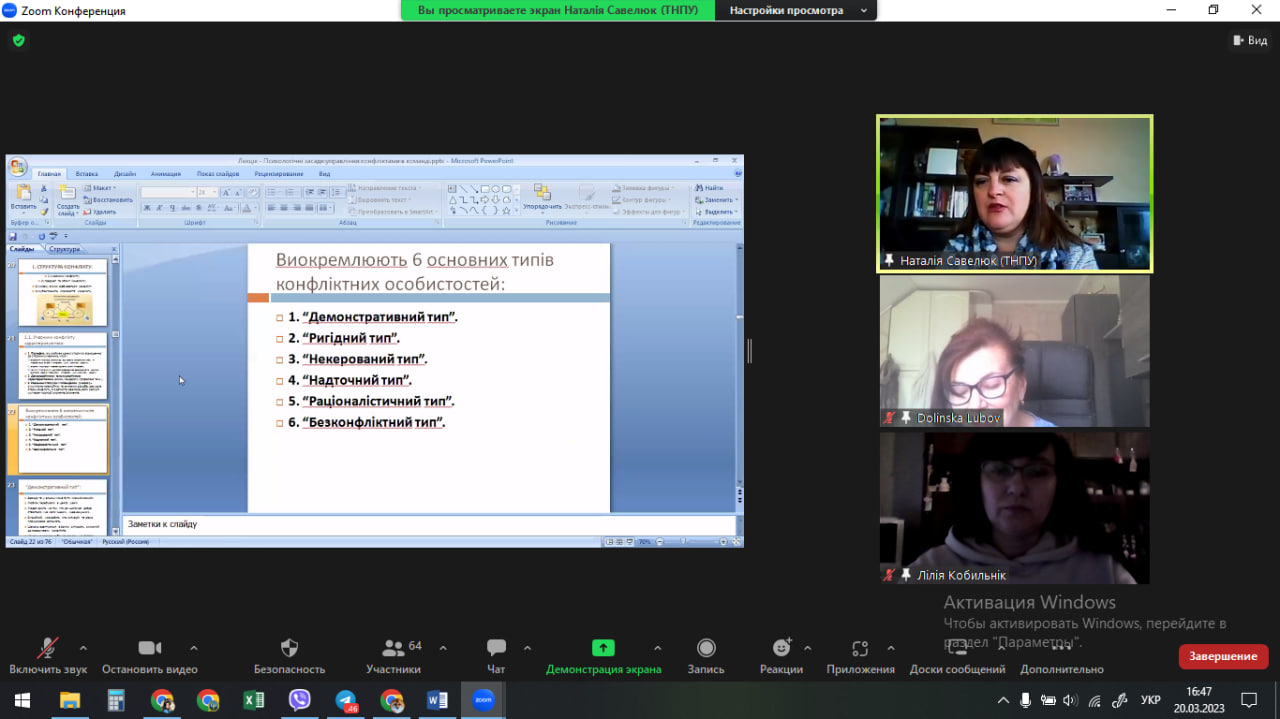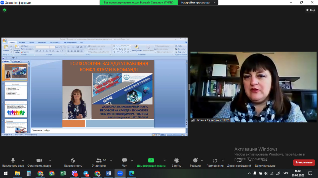 20 березня для здобувачів спеціальності 053 Психологія докторка психологічних наук, професорка кафедри психології Тернопільського національного педагогічного університету імені Володимира Гнатюка і професорка кафедри соціальної роботи та психології Національного університету «Запорізька політехніка» Наталія Савелюк провела гостьову лекцію «Психологічні засади управління конфліктами в команді».