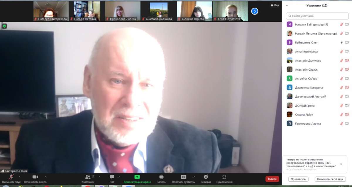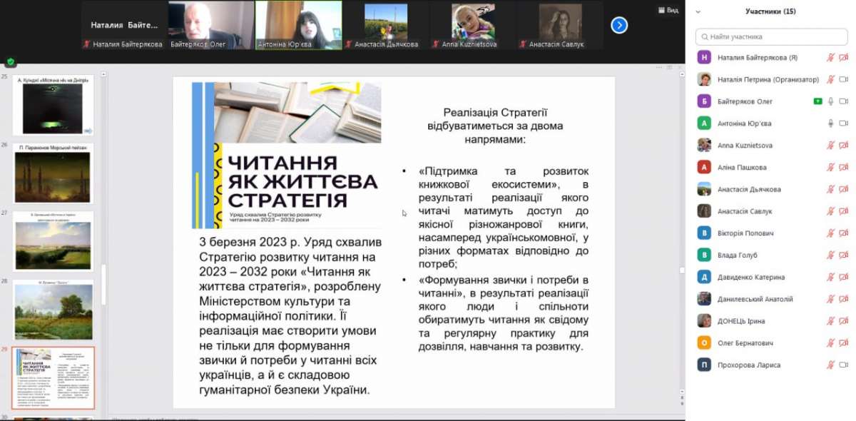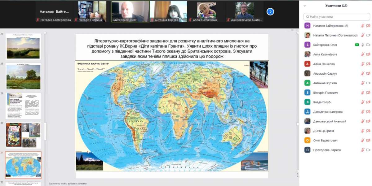 У другій частині лекції Олег Зуфарович поділився досвідом і власною методикою застосування творів живопису в географічній освіті для формування ключових компетентностей у здобувачів освіти. В ході лекції було проведено тренінг з комплексного географічного аналізу творів живопису на прикладі картин українських художників М. Сергіїва «Яблуні в цвіту», К. Крижицького «Вечір в Україні», А. Куїнджі «Нива» та ін. На прикладі застосування картин українських художників учасники також ознайомились із методичними аспектами формування навичок орієнтування на місцевості. Третю частину лекції було присвячено методичним особливостям використання творів художньої літератури для виконання картографічних завдань. Зокрема, за сюжетною лінією роману Ж. Верна «Діти капітана Гранта», аудиторія мала можливість роздивитись систему течій світового океану.