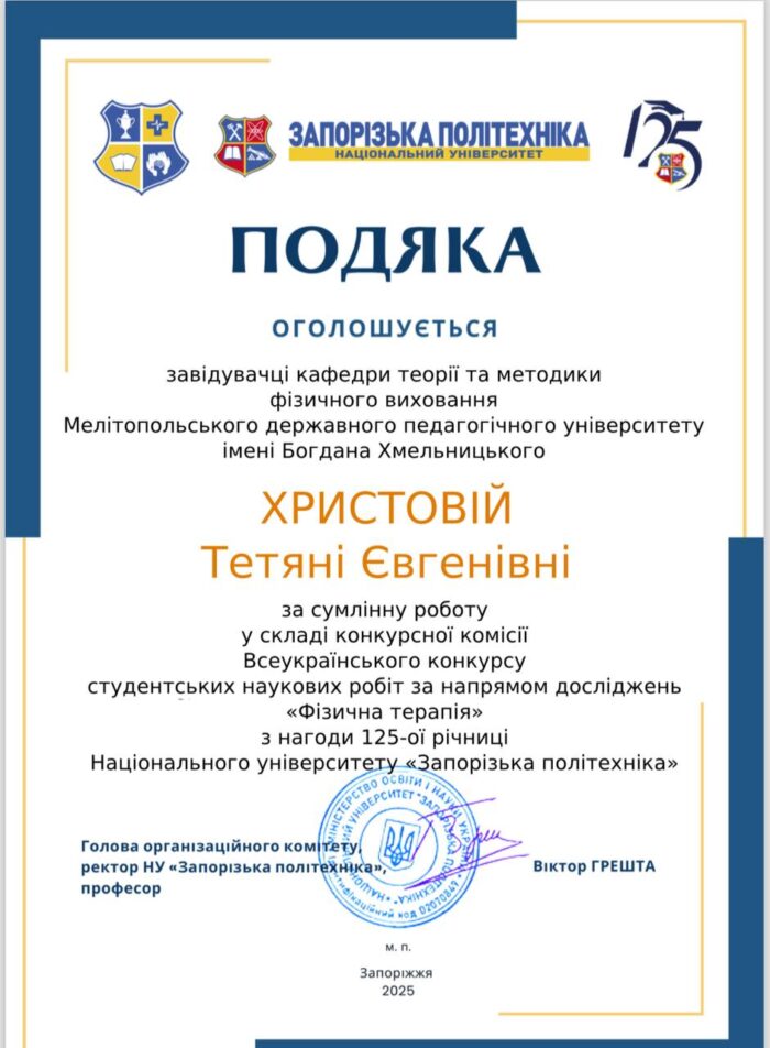 ‼️⭐️ Подяку за сумлінну роботу у складі конкурсної комісії Всеукраїнського конкурсу студентських наукових робіт за напрямом «Фізична терапія» з нагоди 125-річчя ЗНУ отримала