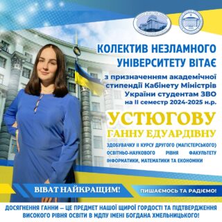 З приємністю та гордістю повідомляємо, що Устюгова Ганна Едуардівна, здобувачка другого курсу другого (магістерського) освітньо-наукового рівня