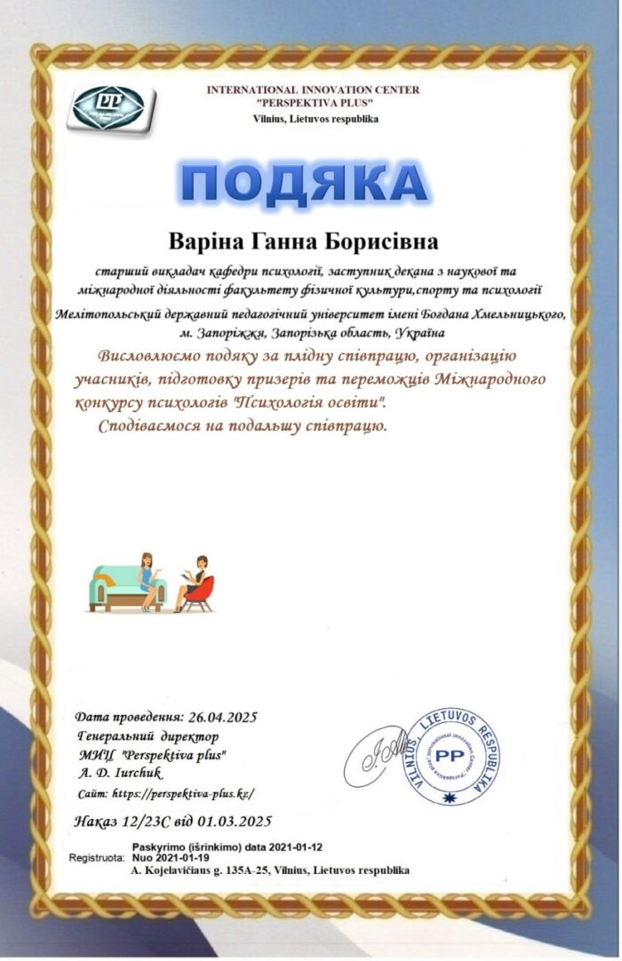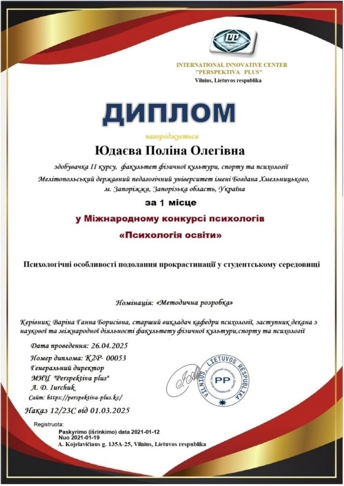 👩🏻🎓✅ Усі конкурсні роботи були підготовлені під чуйним науковим керівництвом Варіної Ганни Борисівни — старшого викладача кафедри психології, заступника декана з наукової та міжнародної діяльності факультету фізичної культури, спорту та психології.