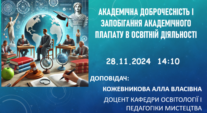 28.11.2024 року фахівчинею Центру експертизи і моніторингу якості освітнього процесу, доценткою кафедри освітології та педагогіки мистецтва Кожевниковою А.В. було проведено семінар для студентських гарантів факультету СПМО на тему «Академічна доброчесність і запобігання академічному плагіату в освітній діяльності».