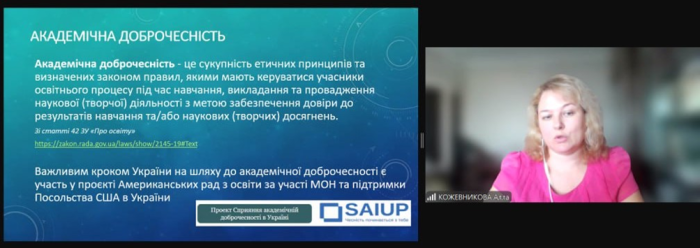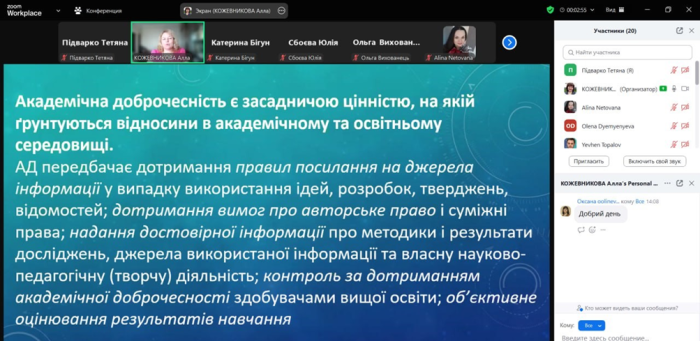 Під час заходу обговорювалися основні принципи академічної доброчесності, такі як чесність, відповідальність, прозорість і повага до авторського права. Учасники отримали практичні рекомендації щодо використання інструментів для перевірки текстів на наявність плагіату, зокрема антиплагіатних систем, а також ознайомилися з механізмами створення унікальних авторських матеріалів.