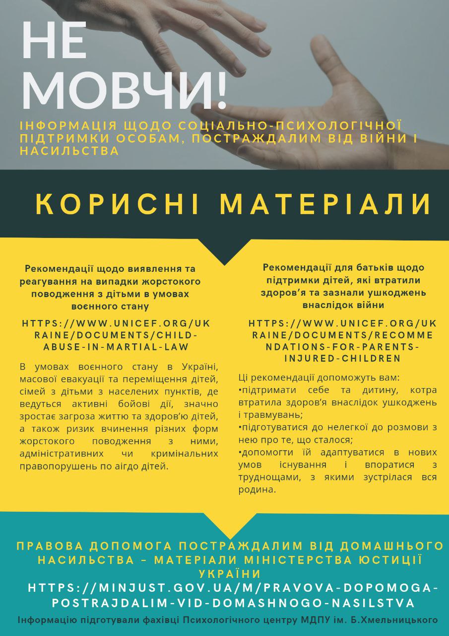 1. Рекомендації щодо виявлення та реагування на випадки жорстокого поводження з дітьми в умовах воєнного стану – https://www.unicef.org/ukraine/documents/child-abuse-in-martial-law