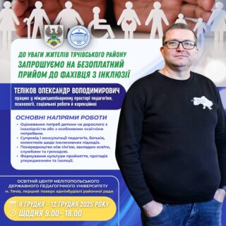 🏛📍Освітній центр Мелітопольського державного педагогічного університету відкриває двері для консультацій із висококваліфікованим фахівцем із інклюзії — Теліковим Олександром, який працює на перетині педагогіки, психології, соціальної роботи та корекційної освіти.