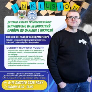 🏛📍Освітній центр Мелітопольського державного педагогічного університету відкриває двері для консультацій із висококваліфікованим фахівцем із інклюзії — Теліковим Олександром, який працює на перетині педагогіки, психології, соціальної роботи та корекційної освіти.