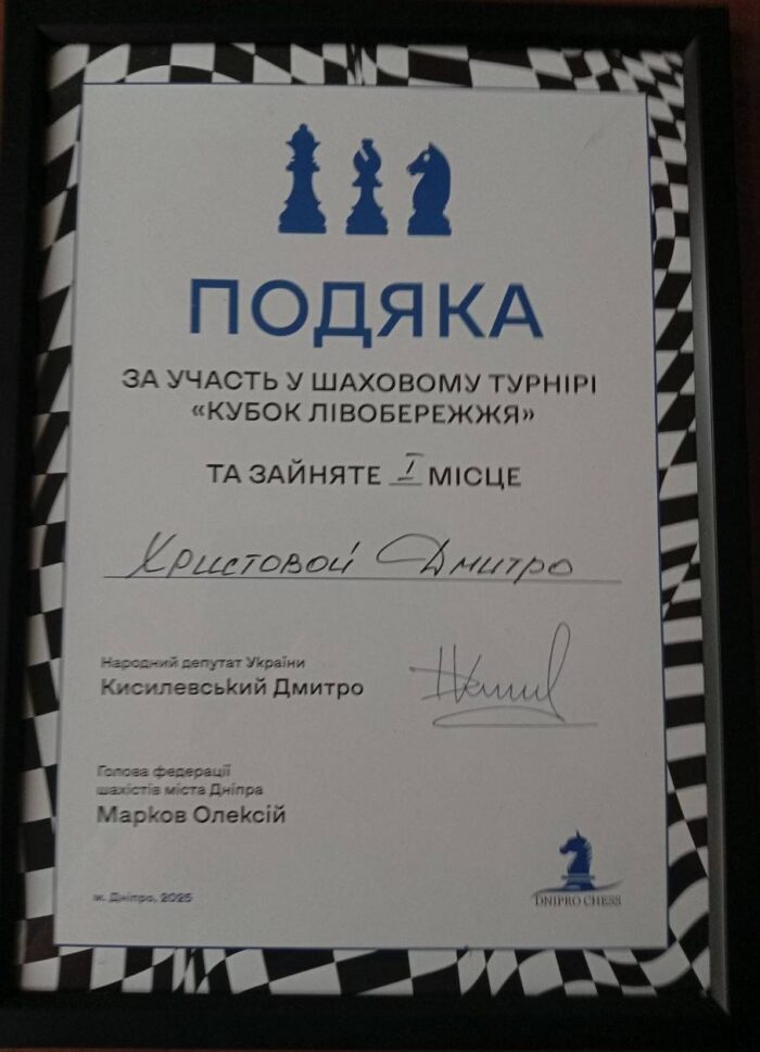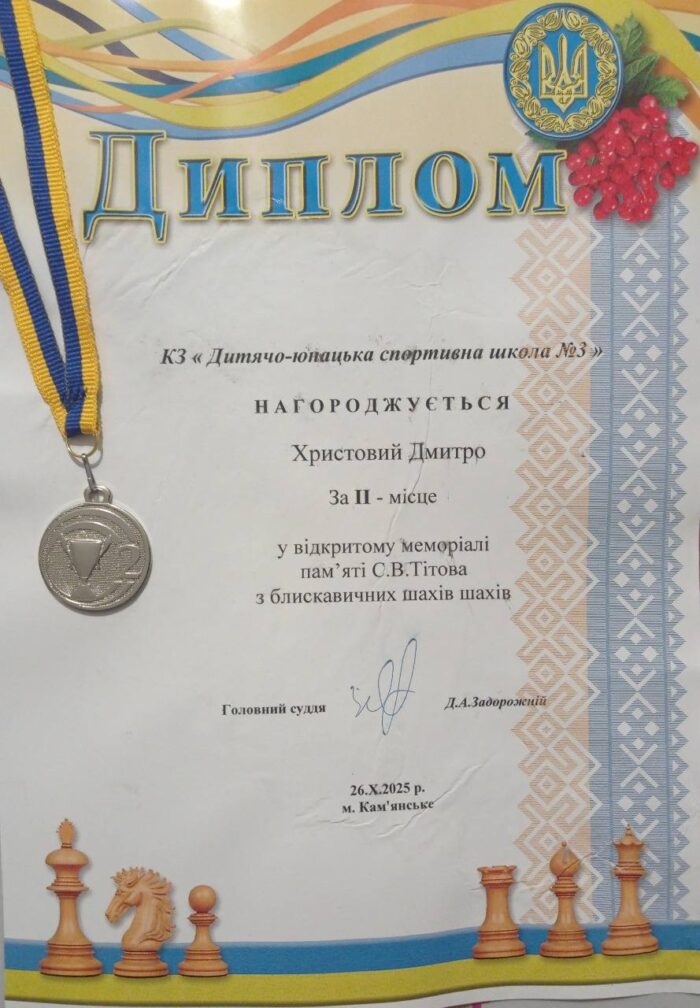 🏆💪🏻26 жовтня 2025 року Дмитро Христовой підтвердив свій високий рівень майстерності у місті Кам’янське. Він взяв участь у ІІ відкритому Меморіалі пам’яті кандидата в майстри спорту України Сергія Тітова. У дев’яти партіях бліц-турніру Дмитро набрав 7 очок і посів почесне друге місце.