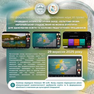 📌👩🏼💼Організатори заходу викладач-стажист Хоменко Наталія та студенти бакалавру групи 115-сг (Капсамун Анна, Перкіна Анастасія, Подзиваловський Олександр) ознайомили присутніх з класифікацією кельтських мов, звернули увагу на географію поширення кельтських мов, продемонстрували серію відео з мальовничими краєвидами та архітектурою місцевостей, звернули увагу на занепад деяких кельтських мов під тиском домінуючих європейських, наголосили на культурному значенні.