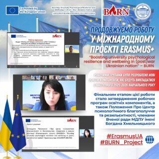 🇪🇺📚В рамках виконання зобов’язань по Міжнародному проєкту ЕРАЗМУС+ “Boosting university psychological resilience and wellbeing in (post-)war Ukrainian nation” (Грантова угода 101129379 (BURN)), робочими групами було розроблено нові освітні компоненти, які будуть викладатися з наступного 2025-2026 навчального року.