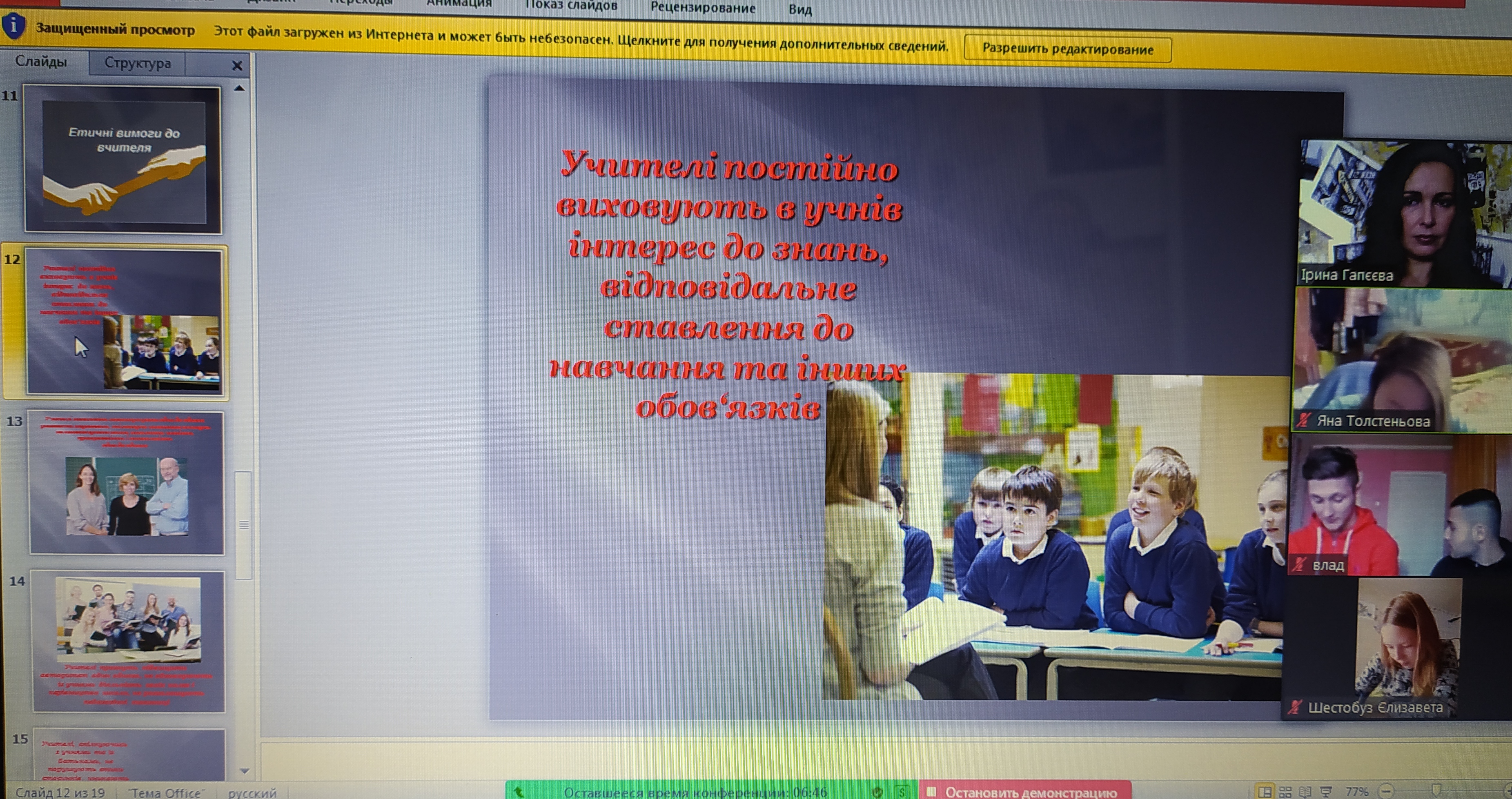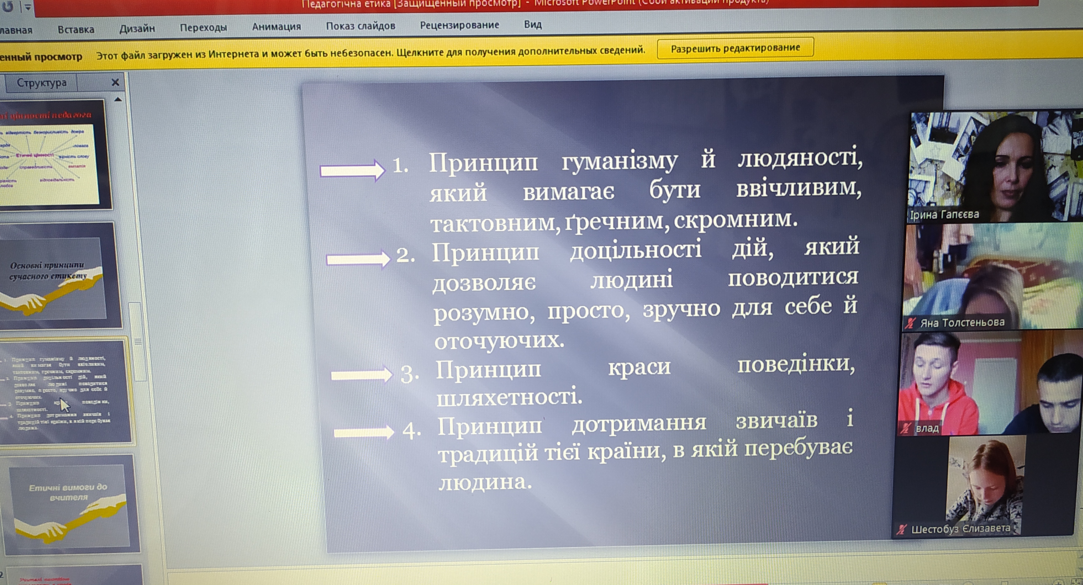 Тема лекції – «Педагогічна етика вчителів української мови і літератури» – дозволила охопити широке коло питань, пов’язаних із професійною діяльністю педагога-філолога, тому досвід запрошеної стейкхолдерки допоміг реалізувати мету заняття та довести здобувачам, що дотримання етичних та естетичних принципів національного менталітету сприятиме вихованню у підростаючого покоління шанобливого ставлення до рідного слова.
