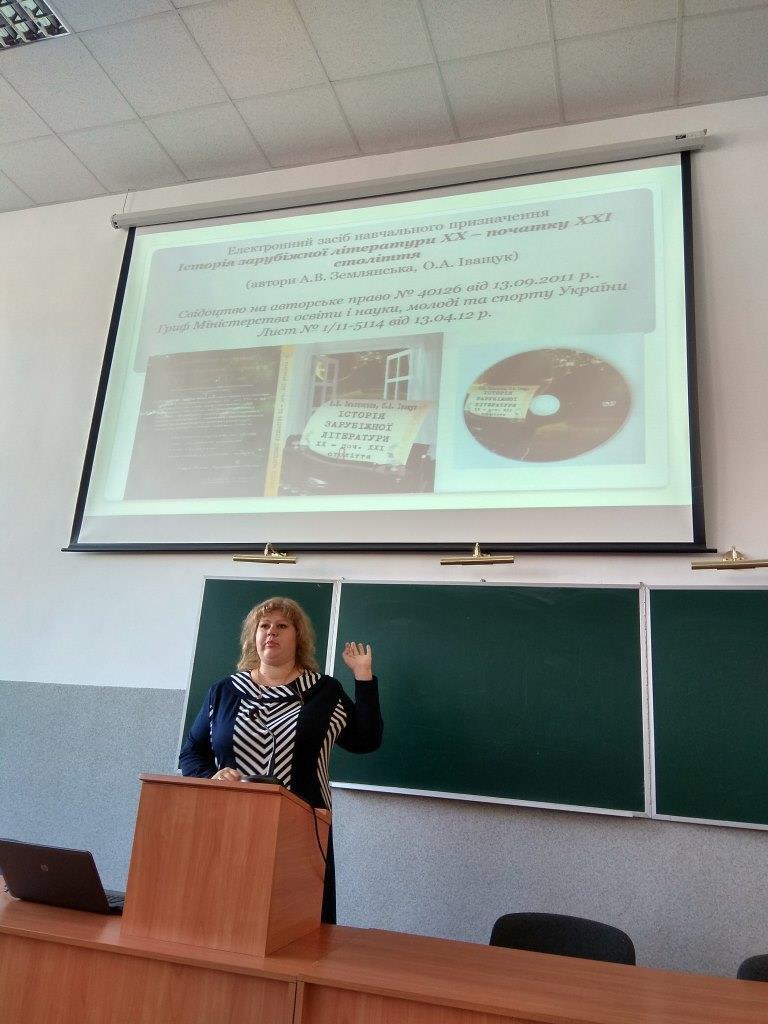 Доцент Землянська А.В. ознайомила із особливостями використання електронних засобів навчального призначення під час викладання філологічних дисциплін та представила методику проведення інтермедіальних зв’язків на уроках літератури.
